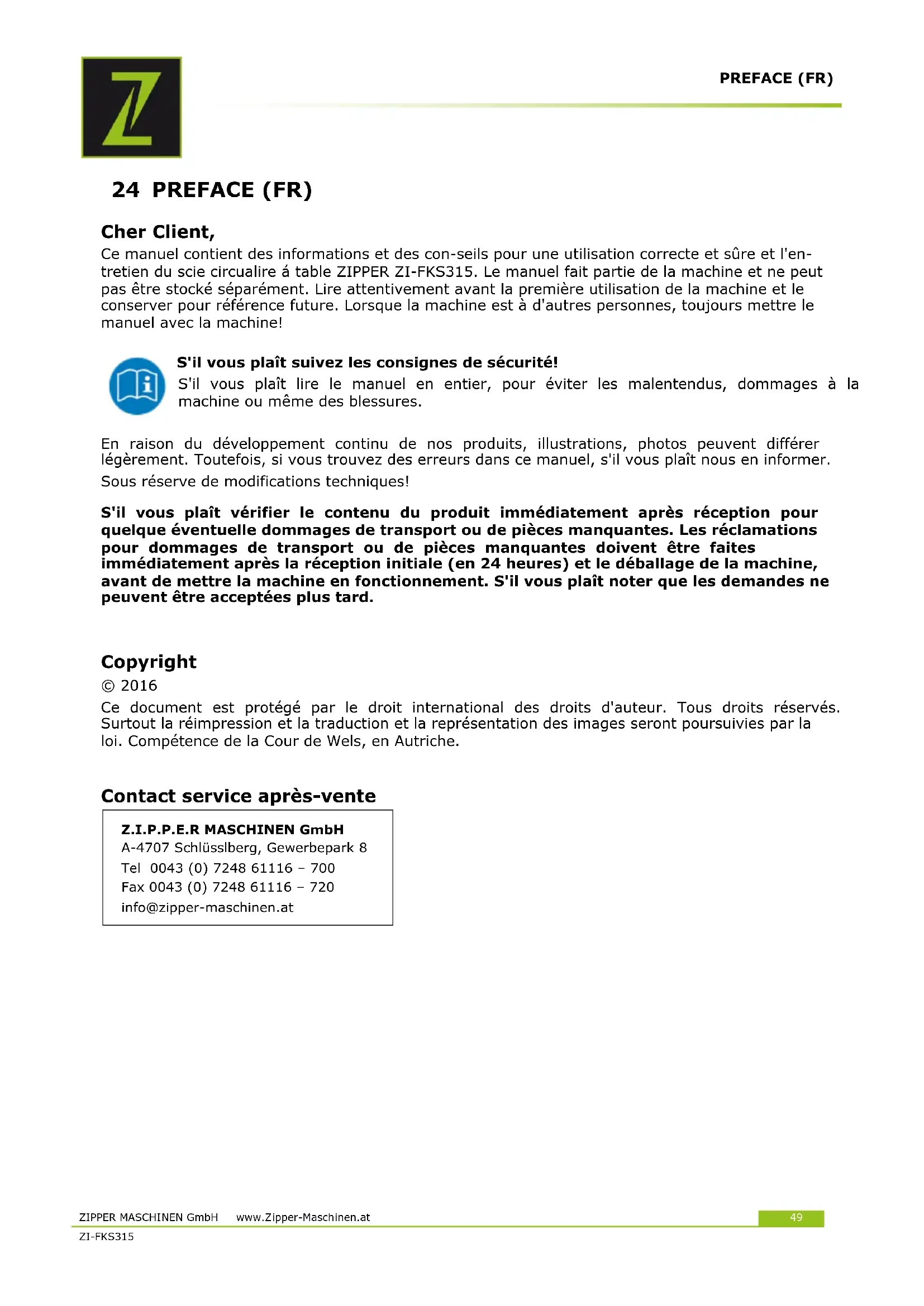 Para mover el chasis fuera, levante suavemente la sierra en la parte trasera y empuje hacia atrás las ruedas 15. Luego baje la sierra. Ahora está de pie sobre las ruedas y puede ser transportado por una persona con la ayuda de las asas 16 fácilmente. Importante: ¡No levante nunca la sierra por el carro! Importante: Después del transporte, el chasis debe ser replegado para garantizar que la sierra está de pie con seguridad. Para ello, ponga las ruedas en su posición inicial siguiendo los pasos al revés.PREFACE (FR) ZIPPER MASCHINEN GmbH www.Zipper-Maschinen.at 49 ZI-FKS315 24 PREFACE (FR) Cher Client, Ce manuel contient des informations et des con-seils pour une utilisation correcte et sûre et l'en- tretien du scie circualire á table ZIPPER ZI-FKS315. Le manuel fait partie de la machine et ne peut pas être stocké séparément. Lire attentivement avant la première utilisation de la machine et le conserver pour référence future. Lorsque la machine est à d'autres personnes, toujours mettre le manuel avec la machine! S'il vous plaît suivez les consignes de sécurité! S'il vous plaît lire le manuel en entier, pour éviter les malentendus, dommages à la machine ou même des blessures. En raison du développement continu de nos produits, illustrations, photos peuvent différer légèrement. Toutefois, si vous trouvez des erreurs dans ce manuel, s'il vous plaît nous en informer. Sous réserve de modifications techniques! S'il vous plaît vérifier le contenu du produit immédiatement après réception pour quelque éventuelle dommages de transport ou de pièces manquantes. Les réclamations pour dommages de transport ou de pièces manquantes doivent être faites immédiatement après la réception initiale (en 24 heures) et le déballage de la machine, avant de mettre la machine en fonctionnement. S'il vous plaît noter que les demandes ne peuvent être acceptées plus tard.