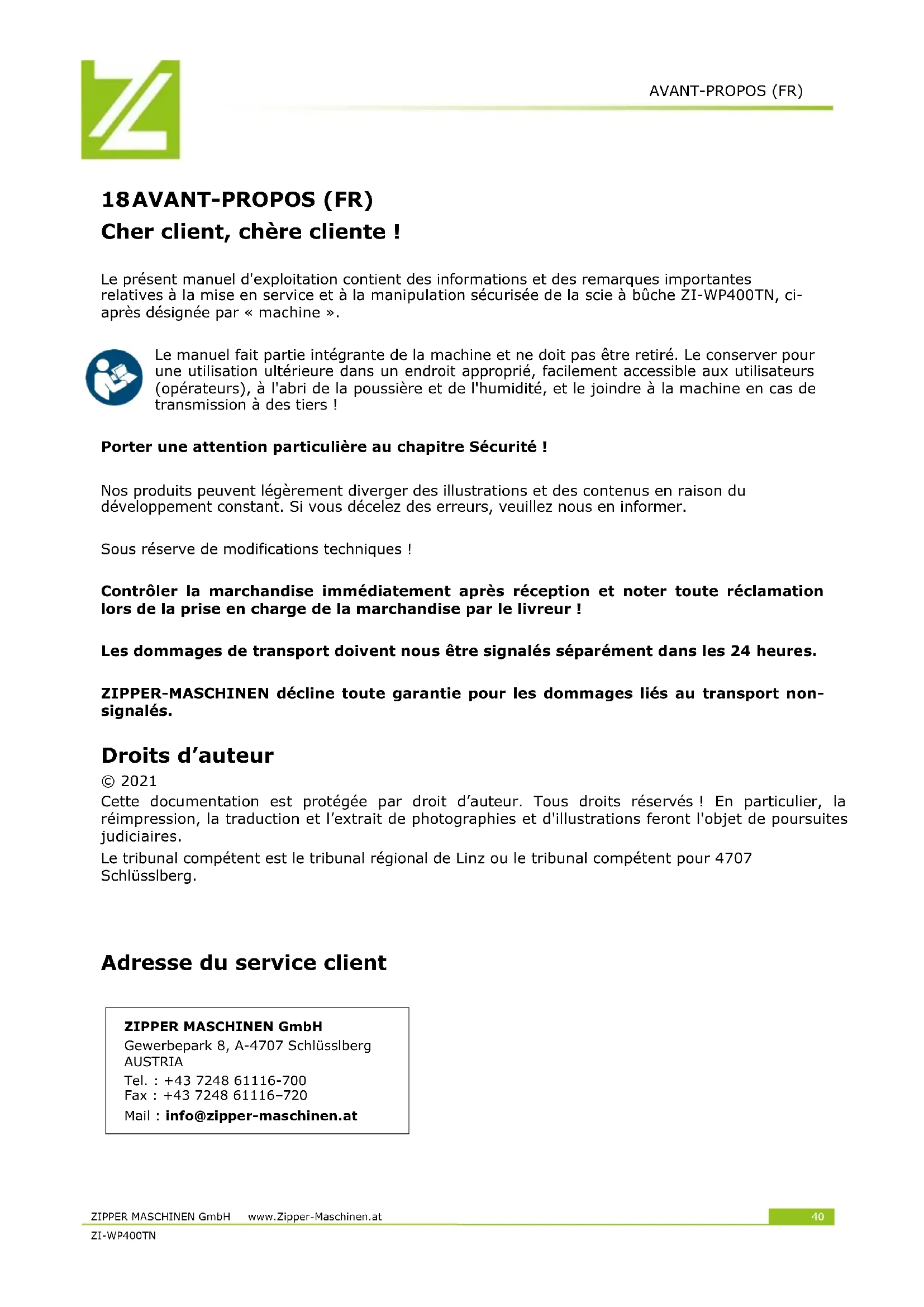 - Exchange saw bladeAVANT-PROPOS (FR) ZIPPER MASCHINEN GmbH www.Zipper-Maschinen.at 40 ZI-WP400TN 18 AVANT-PROPOS (FR) Cher client, chère cliente ! Le présent manuel d'exploitation contient des informations et des remarques importantes relatives à la mise en service et à la manipulation sécurisée de la scie à bûche ZI-WP400TN, ci- après désignée par « machine ». Le manuel fait partie intégrante de la machine et ne doit pas être retiré. Le conserver pour une utilisation ultérieure dans un endroit approprié, facilement accessible aux utilisateurs (opérateurs), à l'abri de la poussière et de l'humidité, et le joindre à la machine en cas de transmission à des tiers ! Porter une attention particulière au chapitre Sécurité ! Nos produits peuvent légèrement diverger des illustrations et des contenus en raison du développement constant. Si vous décelez des erreurs, veuillez nous en informer. Sous réserve de modifications techniques ! Contrôler la marchandise immédiatement après réception et noter toute réclamation lors de la prise en charge de la marchandise par le livreur ! Les dommages de transport doivent nous être signalés séparément dans les 24 heures. ZIPPER-MASCHINEN décline toute garantie pour les dommages liés au transport non- signalés. Droits d’auteur © 2021 Cette documentation est protégée par droit d’auteur. Tous droits réservés ! En particulier, la réimpression, la traduction et l’extrait de photographies et d'illustrations feront l'objet de poursuites judiciaires. Le tribunal compétent est le tribunal régional de Linz ou le tribunal compétent pour 4707 Schlüsslberg.
