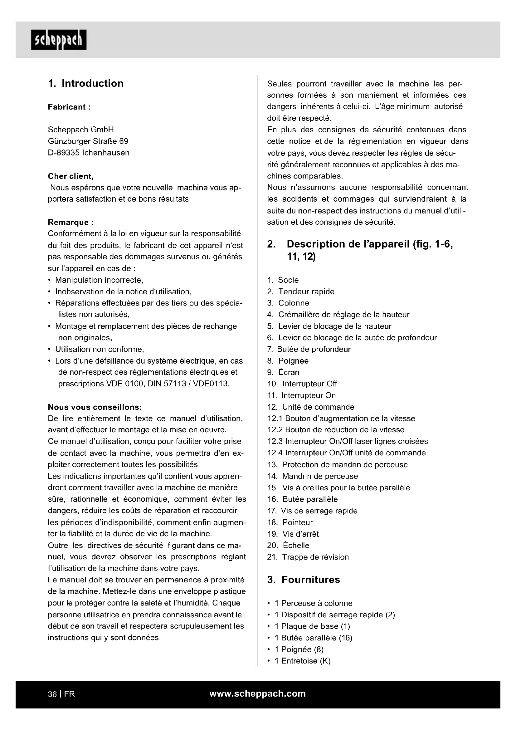 Fabricant : Scheppach GmbH Günzburger Straße 69 D-89335 Ichenhausen Cher client, Nous espérons que votre nouvelle machine vous ap- portera satisfaction et de bons résultats. Remarque : Conformément à la loi en vigueur sur la responsabilité du fait des produits, le fabricant de cet appareil n‘est pas responsable des dommages survenus ou générés sur l‘appareil en cas de :