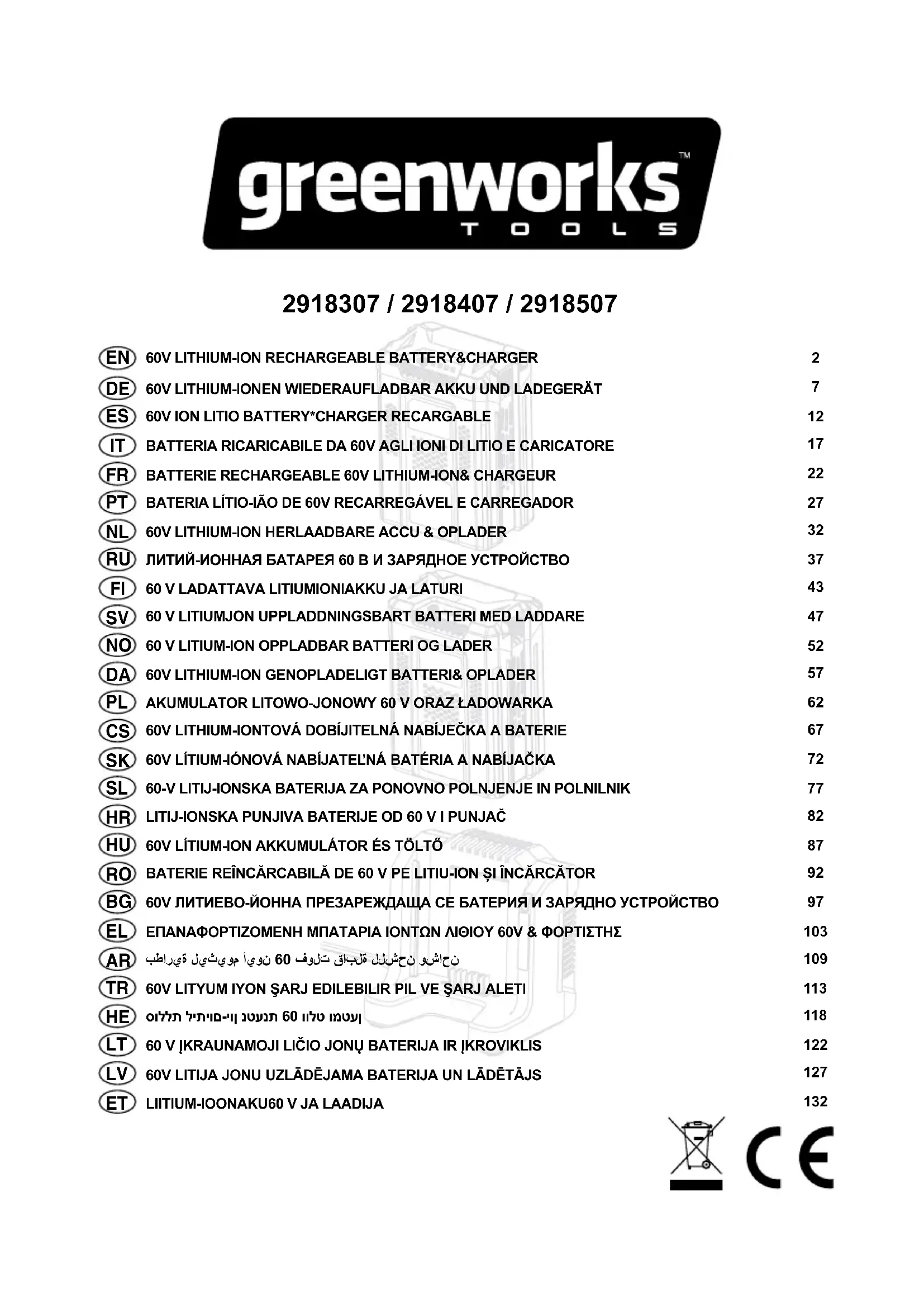 supplémentaires non fournis ou approuvés par Greenworks Tools Europe GmbH. Garantie Une preuve d'achat est requise pour faire valoir la garantie d'un produit liée à cette politique. Le relevé de carte de crédit ne constitue pas une preuve d'achat sufsante. En cas de problème couvert par la garantie, le consommateur doit apporter le produit et sa preuve d'achat au lieu d'achat original. L'appareil sera par la suite expédié à un centre de réparation an d'y être examiné. En présence de dommage, l'appareil sera réparé et renvoyé gratuitement à l'adresse du consommateur. Il convient de noter que les appareils dont le prix de vente est inférieur à 100 € euros (TTC) sont généralement remplacés par un produit neuf. Si le centre de réparation juge que l'appareil n'est pas défectueux, il avertira le consommateur qu'il devra payer le coût de la réparation. Cette politique de garantie est soumise à des modications régulières, celles-ci visent à s'adapter aux nouveaux produits. Une copie de la politique de garantie est disponible à l’adresse www.greenworkstools. eu. СРОК ГАРАНТИИ Все новые агрегаты поставляются, в случае домашнего использования, с 2-летней гарантией от первоначальной даты покупки на запчасти и работу по ремонту, и 1 год на аккумуляторные батареи и, в случае коммерческого использования, с гарантией 90 дней от первоначальной даты покупки на запчасти и работу по ремонту. На профессиональную технику 80Вольт и аккумуляторные ручные инструменты 24Вольт (отвертки, дрели, лобзики, циркулярная пила, гайковерты, фонарик, мульти-устройство) действует гарантия в 1 год. Эта гарантия не подлежит передаче. ОГРАНИЧЕНИЯ Настоящая гарантия распространяется только на дефектные части / компоненты и не охватывает ремонт, который потребовался как