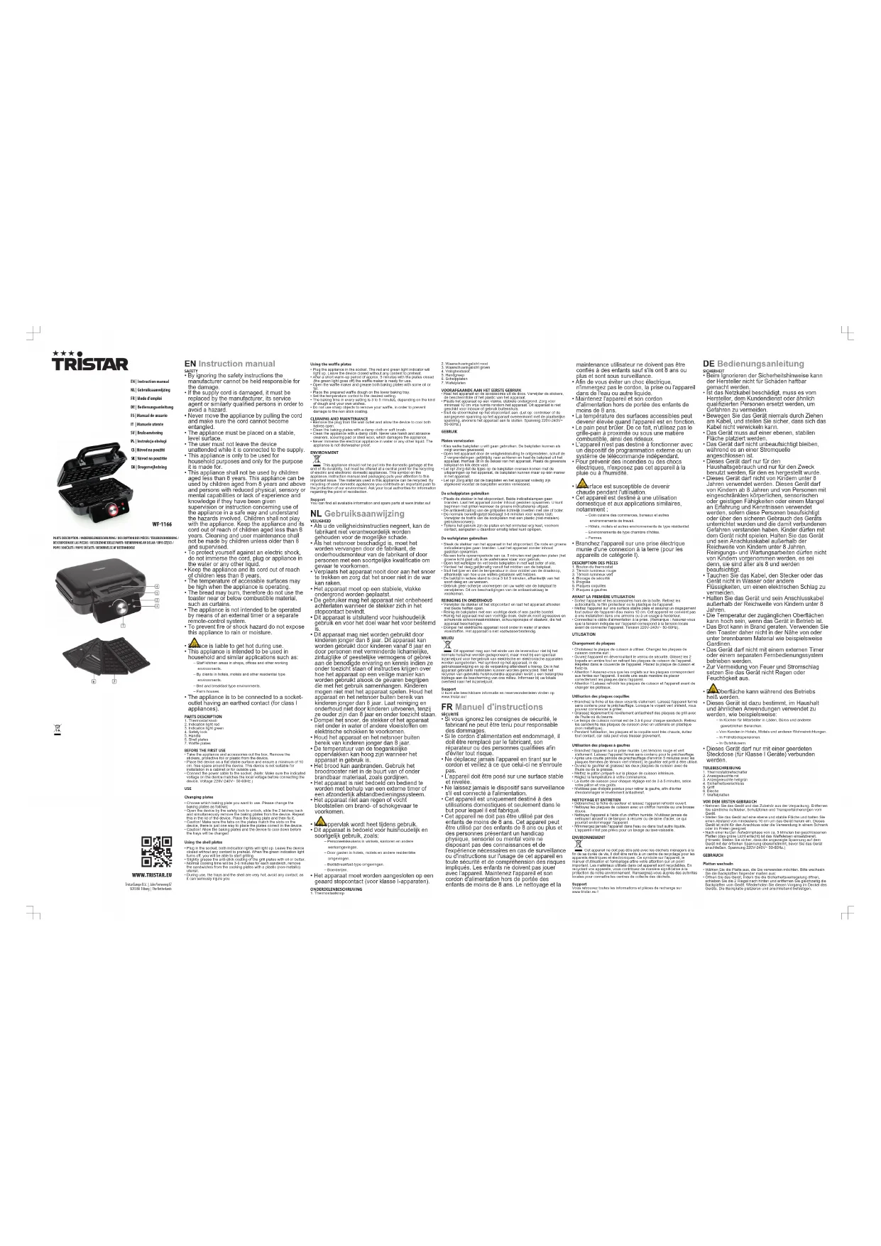 - Branchez l'appareil sur une prise électrique munie d'une connexion à la terre (pour les appareils de catégorie I). DESCRIPTION DES PIÈCES1. Bouton du thermostat2. Témoin lumineux rouge3. Témoin lumineux vert4. Blocage de sécurité5. Poignée6. Plaques coquilles7. Plaques à gaufresAVANT LA PREMIÈRE UTILISATION• Sortez l'appareil et les accessoires hors de la boîte.Retirez lesautocollants, le film protecteur ou le plastique de l'appareil.• Mettez l'appareil sur une surface stable plate et assurez un dégagementtout autour de l'appareil d'au moins 10 cm. Cet appareil ne convient pasà une installation dans une armoire ou à un usage à l'extérieur.• Connectez le câble d'alimentation à la prise. (Remarque : Assurez-vousque la tension indiquée sur l'appareil correspond à la tension localeavant de connecter l'appareil. Tension 220V-240V~ 50-60Hz).UTILISATIONChangement de plaques• Choisissez la plaque de cuisson à utiliser. Changez les plaques decuisson comme suit ;• Ouvrez l'appareil en déverrouillant le verrou de sécurité. Glissez les 2loquets en arrière tout en retirant les plaques de cuisson de l'appareil.Répétez dans le couvercle de l'appareil. Placez la plaque de cuisson etfixez-la.• Attention! Assurez-vous que les onglets sur les plaques correspondentaux fentes sur l'appareil. Il existe une seule manière de placercorrectement les plaques dans l'appareil.• Attention! Laissez refroidir les plaques de cuisson et l'appareil avant dechanger les plateaux.Utilisation des plaques coquilles• Branchez la fiche et les deux voyants s'allument. Laissez l'appareil fermésans contenu pour le préchauffage. Lorsque le voyant vert s'éteint, vouspouvez commencer à griller.• Graissez légèrement le revêtement antiadhésif des plaques de grill avecde l'huile ou du beurre.• Le temps de cuisson normal est de 3 à 6 pour chaque sandwich. Retirezles sandwichs des plaques de cuisson avec un ustensile en plastique(non métallique).• Pendant l'utilisation, les plaques et la coquille sont très chauds, éviteztout contact, car cela peut vous blesser gravement.Utilisation des plaques à gaufres• Branchez l'appareil sur la prise murale. Les témoins rouge et verts'allument. Laissez l'appareil fermé sans contenu pour le préchauffage.• Après une courte période de préchauffage d'environ 5 minutes avec lesplaques fermées (le témoin vert s'éteint), le gaufrier est prêt à être utilisé.• Ouvrez le gaufrier et graissez les deux plaques de cuisson avec del'huile ou de la graisse.• Mettez le pâton préparé sur la plaque de cuisson inférieure.• Réglez la température à votre convenance.• La durée de cuisson pour chaque réglage est de 3 à 5minutes, selonvotre pâton et vos goûts.• N'utilisez pas d'objets pointus pour retirer la gaufre, afin d'éviterd'endommager le revêtement antiadhésif.NETTOYAGE ET ENTRETIEN• Débranchez la fiche du secteur et laissez l’appareil refroidir ouvert.• Nettoyez les plaques de cuisson avec un chiffon humide ou une brossedouce.• Nettoyez l'appareil à l'aide d'un chiffon humide. N'utilisez jamais denettoyant abrasif ni de tampon à récurer ou de laine d'acier, ce quipourrait endommager l'appareil.• N'immergez jamais l'appareil dans l'eau ou dans tout autre liquide.L'appareil n'est pas prévu pour un lavage au lave-vaisselle.ENVIRONNEMENTCet appareil ne doit pas être jeté avec les déchets ménagers à lafin de sa durée de vie, il doit être remis à un centre de recyclage pour lesappareils électriques et électroniques. Ce symbole sur l'appareil, lemanuel d'utilisation et l'emballage attire votre attention sur un pointimportant. Les matériaux utilisés dans cet appareil sont recyclables. Enrecyclant vos appareils, vous contribuez de manière significative à laprotection de notre environnement. Renseignez-vous auprès des autoritéslocales pour connaître les centres de collecte des déchets.SupportVous retrouvez toutes les informations et pièces de rechange surwww.tristar.eu! DEBedienungsanleitung SICHERHEIT