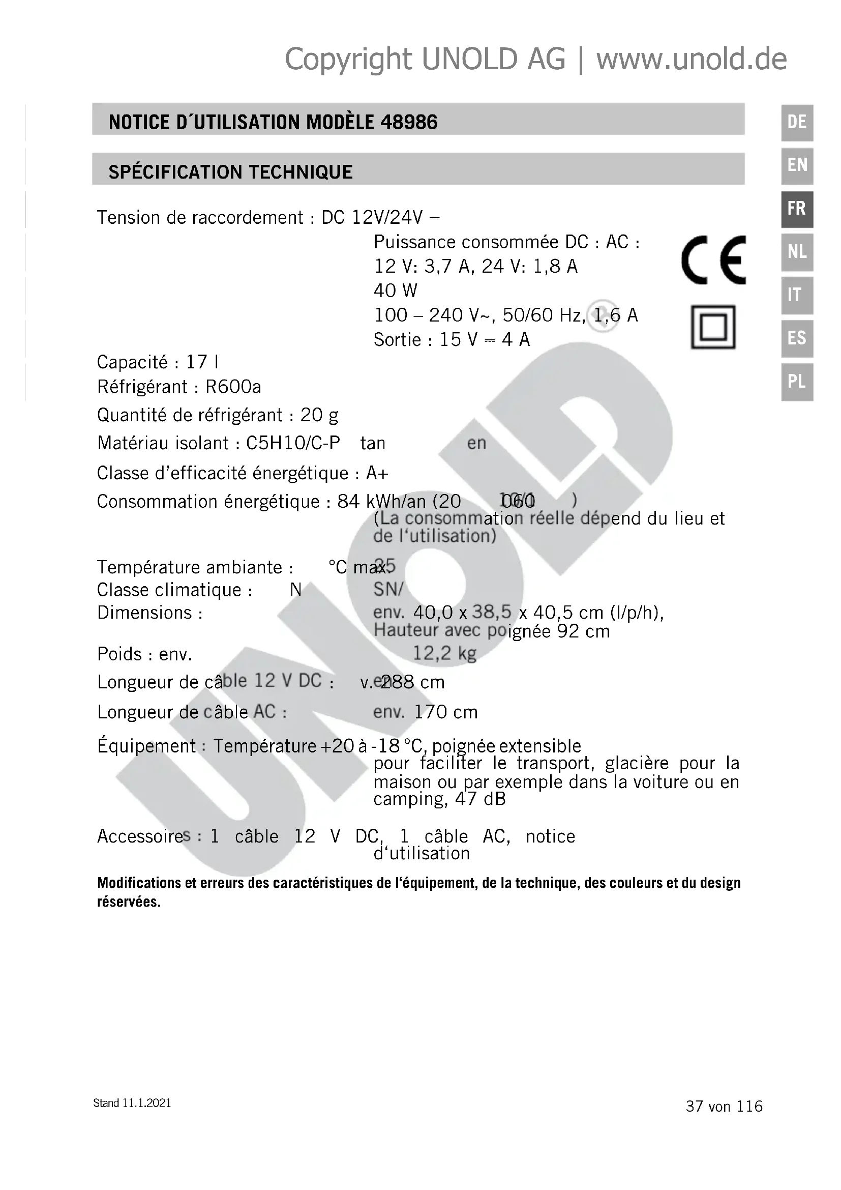 TRAITEMENT DES DÉCHETS / PROTECTION DE L’ENVIRONNEMENT Nos appareils sont produits selon un standard élevé de qualité pour une longue durée d’uti- lisation. Un entretien régulier et des réparations compétentes par notre service après-vente prolongent cette durée d’utilisation. Si néanmoins l’appareil est endommagé et ne peut plus être réparé, veuillez suivre les instructions suivantes. Ne jamais disposer ce produit avec les dégâts de ménage. Apportez ce produit à une station de collection pour récupération de pro- duits électriques et électroniques. Par la collection séparée vous aidez à protéger les ressources naturelles et prenez soin, que le produit est démonté sans risque pour la santé et l’environnement. L’isolation de l’appareil contient un produit réfrigérant et doit être jetée correctement et conformément aux réglementations relatives à la protection de l’environnement. En cas de doute, renseignez-vous auprès des services de collecte des ordures de votre commune. En cas d’utilisation conforme et lors de dégâts manifestement dus à des défauts de fabrication, nos appareils sont garantis 24 mois, lors d’utilisation professionnelles 12 mois, à dater de l’achat pour les dommages qui sont manifestement attribuables à des défauts d’usine lorsqu’ils sont utilisés comme prévu. Pendant la période de garantie, nous réparerons les défauts de matériaux et de fabrication à notre discrétion en les réparant ou en les échangeant. Notre garantie n’est valide que pour les appareils vendus en Allemagne et en Autriche. Dans tout autre pays veuillez contacter l’importateur. Veuillez envoyer à notre adresse les appareils, pour lesquels vous réclamez une suppression de défauts, avec le bon d’achat montrant la date d’achat. Vous pouvez impri- mer un coupon de retournement sur notre site Web www.unold.de/ruecksendung. (uniquement pour les entrées d’Allemagne et d’Autriche). Les défauts causés par usure, utilisation incorrecte ou non-respect des instructions de maintenance sont exclus. Notre obligation de garantie cesse, si de réparations ou des interventions sont accomplies par des tiers. Cette garantie n’affecte pas les droits du consommateur contre le commerçant. Réfrigérant: R600a Copyright UNOLD AG | www.unold.de52 von 116 Stand 11.1.2021