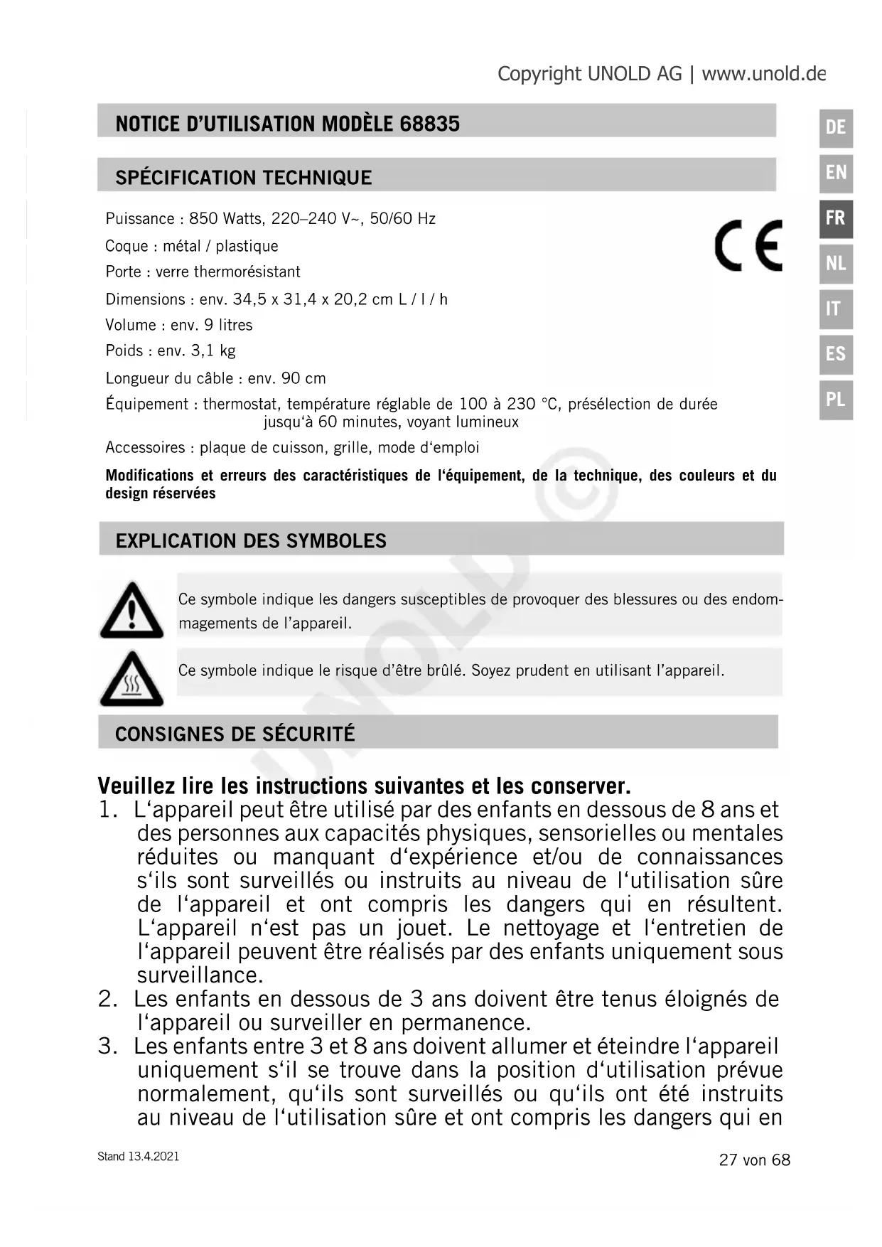 Ce symbole indique les dangers susceptibles de provoquer des blessures ou des endom- magements de l’appareil. Ce symbole indique le risque d’être brûlé. Soyez prudent en utilisant l’appareil. Copyright UNOLD AG | www.unold.de UNOLD ©28 von 68 Stand 13.4.2021