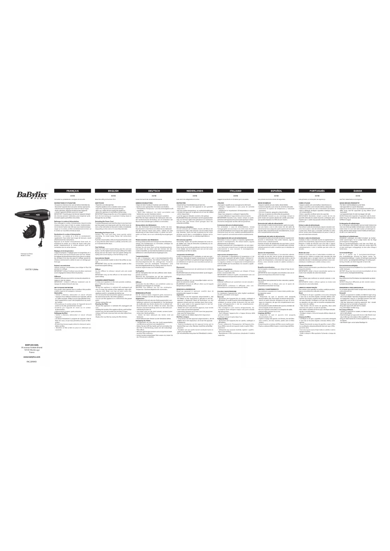 CordKeeper D373E - Sèche-cheveux BABYLISS - Notice d'utilisation et mode d'emploi gratuit