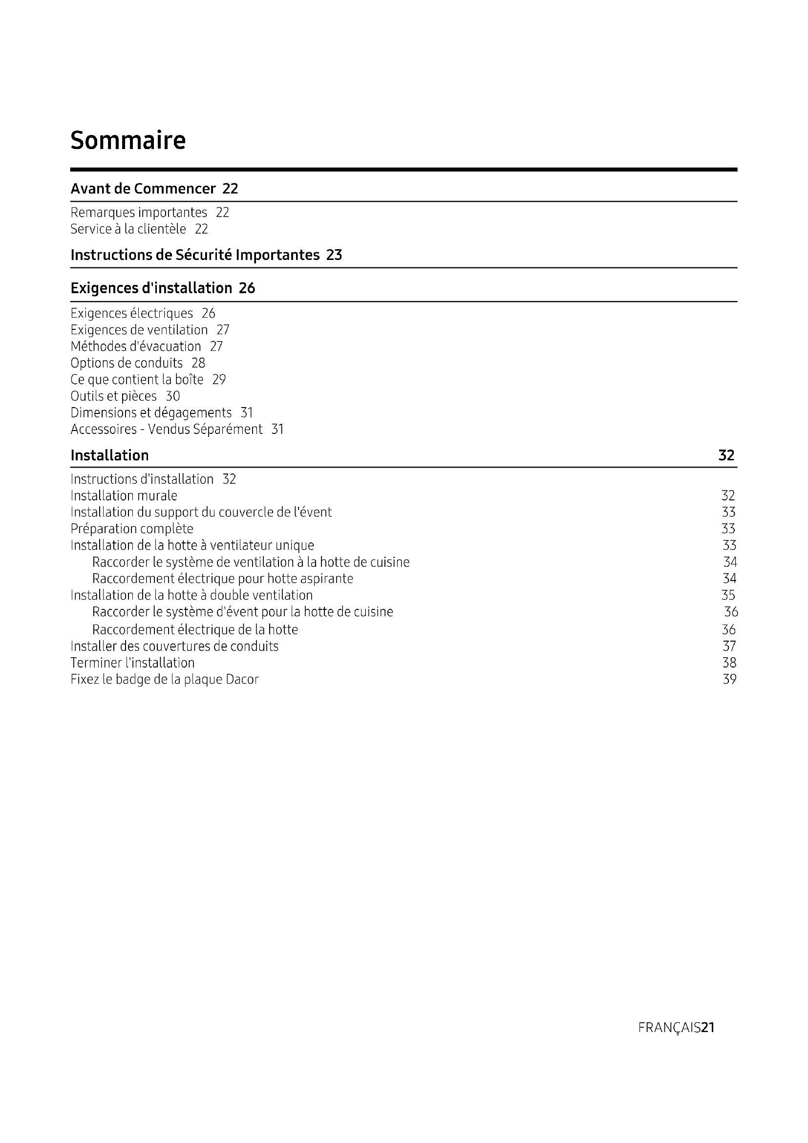 Nous recommandons qu'un technicien qualifié installe la hotte de cuisine. Il incombe à l'installateur de s'assurer que la hotte est conforme aux dégagements d'installation spécifiques pour le produit.