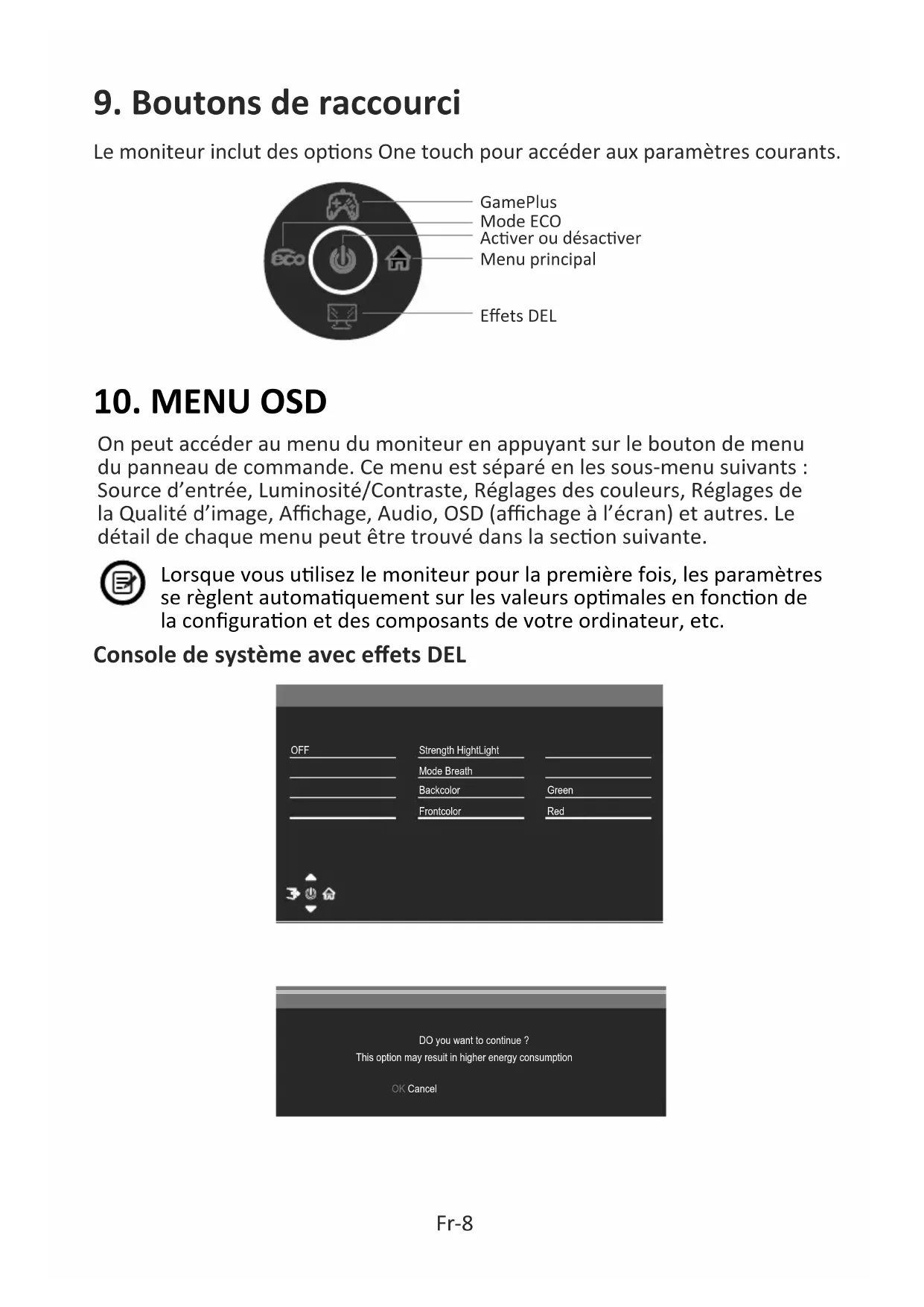 Lorsque vous ulisez le moniteur pour la première fois, les paramètres se règlent automaquement sur les valeurs opmales en foncon de la configuraon et des composants de votre ordinateur, etc. On peut accéder au menu du moniteur en appuyant sur le bouton de menu du panneau de commande. Ce menu est séparé en les sous-menu suivants : Source d’entrée, Luminosité/Contraste, Réglages des couleurs, Réglages de la Qualité d’image, Affichage, Audio, OSD (affichage à l’écran) et autres. Le détail de chaque menu peut être trouvé dans la secon suivante. Strength HightLight OFF Mode BreathBackcolorFrontcolorGreen Red DO you want to continue ?OK CancelThis option may resuit in higher energy consumptionMode collimaon Source d'entrée Signal Changez l’entrée de signal ou séleconnez la source. Type-C, DP, HDMI1, HDMI2. Mode image ECO Mode image Uliser le bouton de raccourci du mode de scène pour changer directement de mode d’image : ECO , Standard, Photo, Film, Jeu, FPS et RTS. Sert à choisir les récules qui peuvent être affichés au centre de l’écran. Fr-9 Collimation ModePoint Collimation1Point Collimation2Cross Collimation1Cross Collimation2