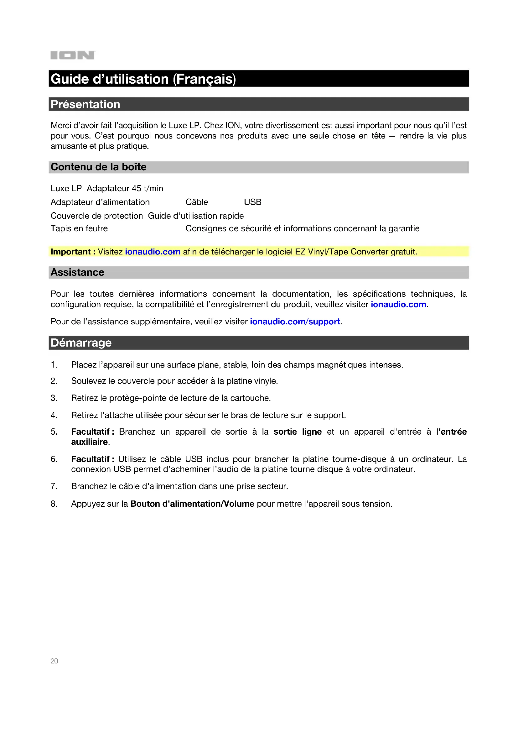 ANTES DE DEVOLVER EL PRODUCTO, comuníquese con ION Audio para solicitar soporte técnico a ionaudio.com/support.20 Guide d’utilisation (Français) Présentation Merci d’avoir fait l’acquisition le Luxe LP. Chez ION, votre divertissement est aussi important pour nous qu’il l’est pour vous. C’est pourquoi nous concevons nos produits avec une seule chose en tête — rendre la vie plus amusante et plus pratique. Contenu de la boîte Luxe LP Adaptateur 45 t/min Adaptateur d’alimentation Câble USB Couvercle de protection Guide d’utilisation rapide Tapis en feutre Consignes de sécurité et informations concernant la garantie Important : Visitez ionaudio.com afin de télécharger le logiciel EZ Vinyl/Tape Converter gratuit. Assistance Pour les toutes dernières informations concernant la documentation, les spécifications techniques, la configuration requise, la compatibilité et l’enregistrement du produit, veuillez visiter ionaudio.com. Pour de l’assistance supplémentaire, veuillez visiter ionaudio.com/support. Démarrage