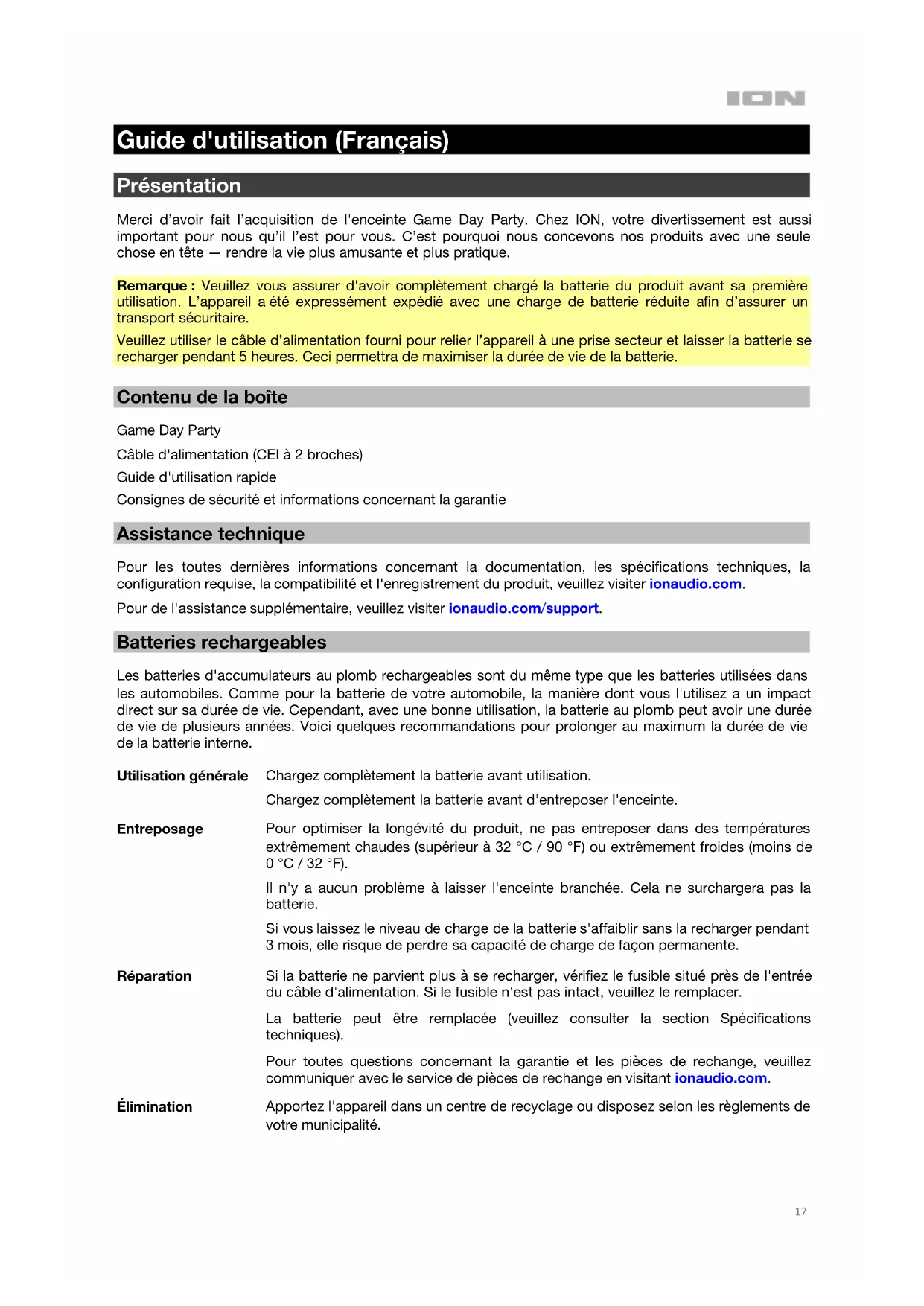- Reinicie la conexión Bluetooth de su dispositivo de audio apagando el Bluetooth y luego volviendo a encenderlo. Puede encontrar esta opción dentro del menú Bluetooth en los ajustes de su teléfono o dispositivo de audio. Si esto no funciona y ya se había conectado al Game Day Party anteriormente, busque Game Day Party en la lista de dispositivos disponibles o previamente conectados en el menú Bluetooth de su dispositivo de audio, toque el icono de engranaje o "i" ubicado junto a él y luego seleccione Desaparear u Olvidar. Apague el Game Day Party, luego vuelva a encenderlo e intente aparearlo nuevamente una vez que vuelva a aparecer en su lista de dispositivos disponibles. Nota: Si Game Day Party ya ha sido recientemente apareado con otro dispositivo de audio que aún se encuentre dentro del alcance, es posible que tenga que repetir este proceso con ese dispositivo de audio para desconectarlo completamente. Si experimenta cortes en el audio al reproducir música desde un dispositivo Bluetooth, es posible que esto suceda debido a que su unidad está intentando enlazarse con otro altavoz. Esto puede ocurrir si apaga un altavoz que estaba enlazado con su unidad o si acaba de encender su unidad y la misma se encuentra en modo Stereo-Link. Para detener los cortes de audio, salga del modo Stereo-Link pulsando dos veces el botón Link. Como alternativa, puede esperar a que su unidad se enlace con otro altavoz Game Day Party si es que hay uno dentro del alcance. Si desea impedir que su unidad se enlace automáticamente cuando la enciende, asegúrese de pulsar dos veces el botón Link para salir del modo Stereo-Link antes de apagarlo.17 Guide d'utilisation (Français) Présentation Merci d’avoir fait l’acquisition de l'enceinte Game Day Party. Chez ION, votre divertissement est aussi important pour nous qu’il l’est pour vous. C’est pourquoi nous concevons nos produits avec une seule chose en tête — rendre la vie plus amusante et plus pratique. Remarque : Veuillez vous assurer d'avoir complètement chargé la batterie du produit avant sa première utilisation. L’appareil a été expressément expédié avec une charge de batterie réduite afin d’assurer un transport sécuritaire. Veuillez utiliser le câble d’alimentation fourni pour relier l’appareil à une prise secteur et laisser la batterie se recharger pendant 5 heures. Ceci permettra de maximiser la durée de vie de la batterie. Contenu de la boîte Game Day Party Câble d'alimentation (CEI à 2 broches) Guide d'utilisation rapide Consignes de sécurité et informations concernant la garantie Assistance technique Pour les toutes dernières informations concernant la documentation, les spécifications techniques, la configuration requise, la compatibilité et l'enregistrement du produit, veuillez visiter ionaudio.com. Pour de l'assistance supplémentaire, veuillez visiter ionaudio.com/support. Batteries rechargeables Les batteries d'accumulateurs au plomb rechargeables sont du même type que les batteries utilisées dans les automobiles. Comme pour la batterie de votre automobile, la manière dont vous l'utilisez a un impact direct sur sa durée de vie. Cependant, avec une bonne utilisation, la batterie au plomb peut avoir une durée de vie de plusieurs années. Voici quelques recommandations pour prolonger au maximum la durée de vie de la batterie interne. Utilisation générale Chargez complètement la batterie avant utilisation. Chargez complètement la batterie avant d'entreposer l'enceinte. Entreposage Pour optimiser la longévité du produit, ne pas entreposer dans des températures extrêmement chaudes (supérieur à 32 °C / 90 °F) ou extrêmement froides (moins de 0 °C / 32 °F). Il n'y a aucun problème à laisser l'enceinte branchée. Cela ne surchargera pas la batterie. Si vous laissez le niveau de charge de la batterie s'affaiblir sans la recharger pendant 3 mois, elle risque de perdre sa capacité de charge de façon permanente. Réparation Si la batterie ne parvient plus à se recharger, vérifiez le fusible situé près de l'entrée du câble d'alimentation. Si le fusible n'est pas intact, veuillez le remplacer. La batterie peut être remplacée (veuillez consulter la section Spécifications techniques). Pour toutes questions concernant la garantie et les pièces de rechange, veuillez communiquer avec le service de pièces de rechange en visitant ionaudio.com. Élimination Apportez l'appareil dans un centre de recyclage ou disposez selon les règlements de votre municipalité.18 Installation Mise en route