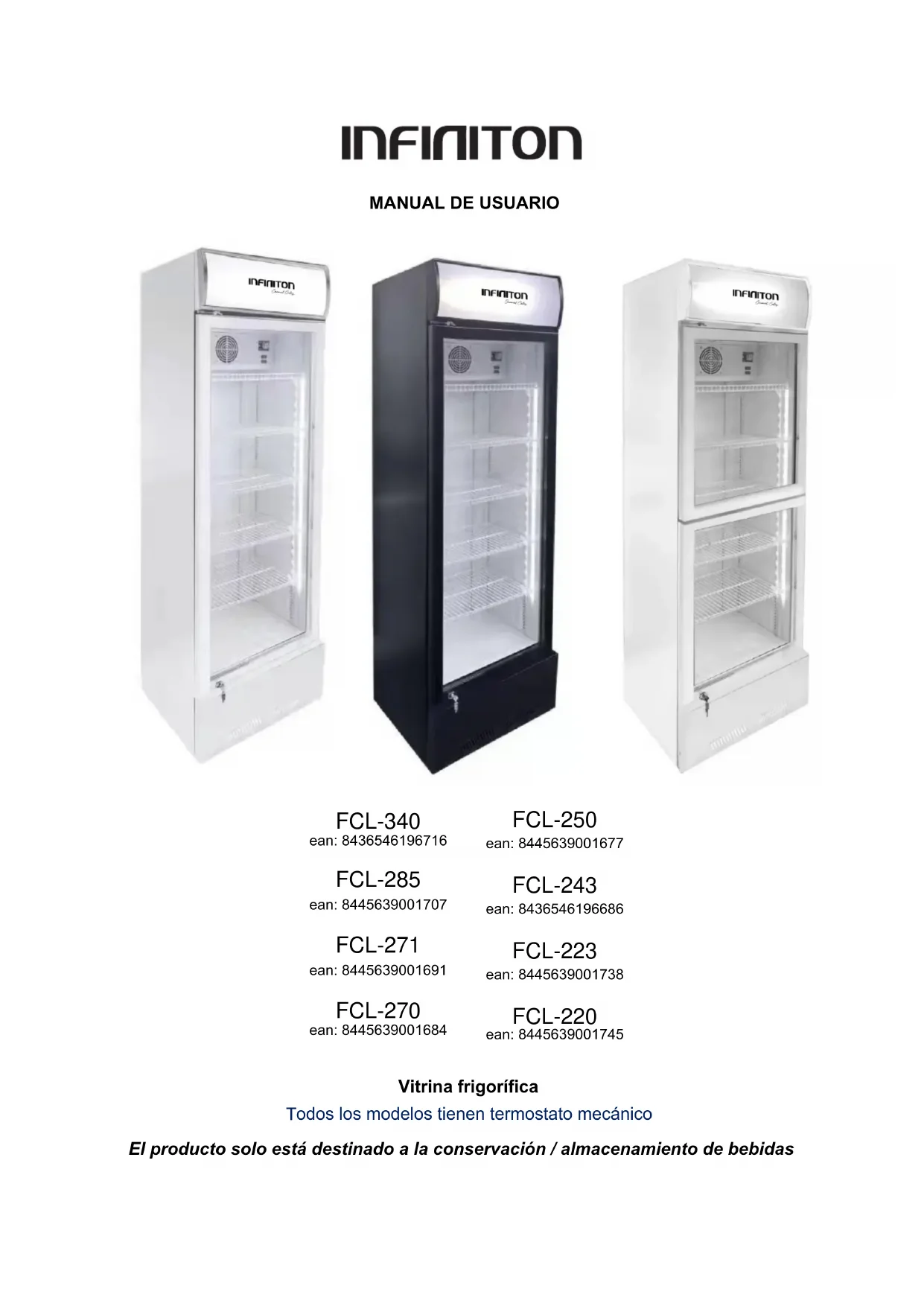 Dans un souci d’amélioration constante de nos produits, nous nous réservons la possibilité de modifier les caractéristiques techniques sans préavis. Les garanties des produits de la marque INFINITON WORLD ELECTRONIC S.L sont exclusivement énoncées par les distributeurs que nous avons choisis. Aucun élément des présentes ne peut être interprété comme une garantie supplémentaire. La société INFINITON WORLD ELECTRONIC S.L ne peut être tenue responsable des erreurs ou des omissions techniques et de rédaction dans les présentes. Document non contractuel.MANUAL DE USUÁRIO Vitrine refrigerada Todos os modelos possuem termostato mecânico O produto destina-se apenas à preservação / armazenamento de bebidas 1nF1n1Ton FCL-340 ean: 8436546196716 FCL-285 ean: 8445639001707 FCL-271 ean: 8445639001691 FCL-270 ean: 8445639001684 FCL-250 ean: 8445639001677 FCL-243 ean: 8436546196686 FCL-223 ean: 8445639001738 FCL-220 ean: 8445639001745v (VWHGLVSRVLWLYRSRGHVHUXVDGRSRUFULDQoDVDSDUWLUGH DQRVHSHVVRDVFRPFDSDFLGDGHVItVLFDVVHQVRULDLVRX PHQWDLVUHGX]LGDVRXIDOWDGHH[SHULrQFLDHFRQKHFLPHQWR VHWLYHUHPUHFHELGRVXSHUYLVmRRXLQVWUXo}HVVREUHRXVR GRGLVSRVLWLYRFRPVHJXUDQoDHHQWHQGHUHPRSHULJR HQYROYLGR v &ULDQoDVGHDDQRVGHLGDGHSRGHPFDUUHJDUH GHVFDUUHJDUHVWHGLVSRVLWLYR v $VFULDQoDVGHYHPVHUVXSHUYLVLRQDGDVSDUDJDUDQWLUTXH QmREULQTXHPFRPRDSDUHOKR v $VFULDQoDVQmRGHYHPOLPSDUHPDQWHURXVXiULRDPHQRV TXHWHQKDPDQRVGHLGDGHRXPDLVHVHMDP VXSHUYLVLRQDGDV v 0DQWHQKDWRGRVRVUHFLSLHQWHVORQJHGDVFULDQoDV([LVWH XPULVFRGHVXIRFDPHQWR v 6HHVWLYHUDHOLPLQDURDSDUHOKRUHWLUHDILFKDGDWRPDGD FRUWHRFDERGHOLJDomRRPDLVSHUWRSRVVtYHOGRDSDUHOKR HUHWLUHDSRUWDSDUDHYLWDUTXHDVFULDQoDVVRIUDPFKRTXHV HOpFWULFRVDRFDLURXIHFKDU