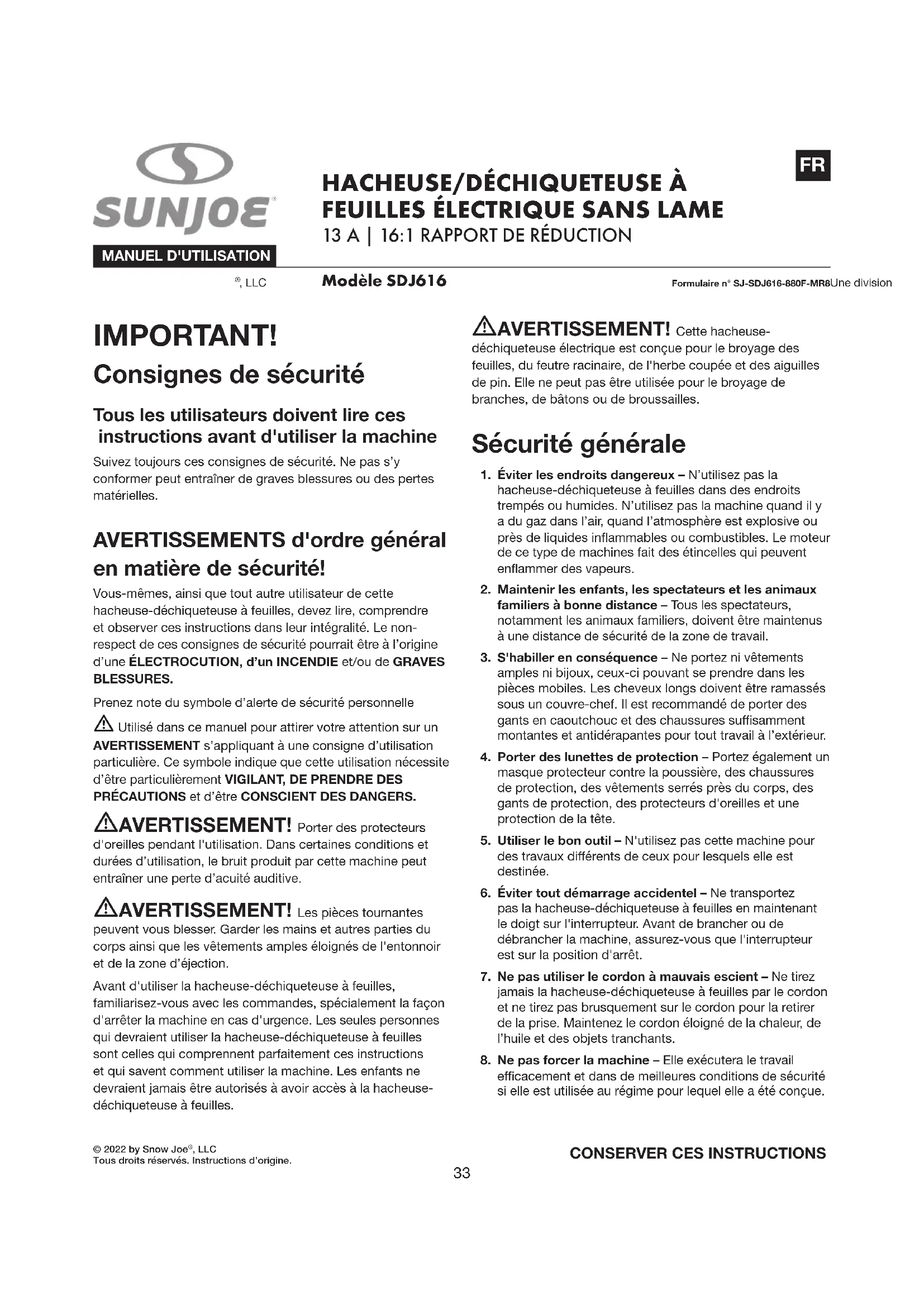 Retrouvez gratuitement la notice de l'appareil SDJ616 Sun Joe au format PDF.