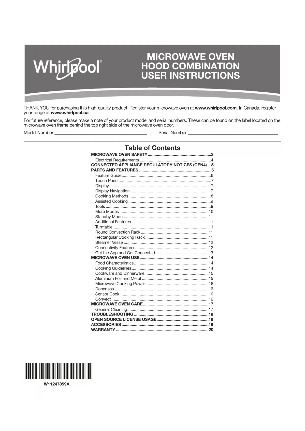 FOUR À MICRO-ONDES MERCI d’avoir acheté ce produit de grande qualité. Enregistrez la cuisinière sur www.whirlpool.ca. Pour référence ultérieure, consignez par écrit les numéros de modèle et de série de votre produit. Vous trouverez les numéros de modèle et de série sur la plaque signalétique située sur le châssis du four, derrière la partie supérieure droite de la porte du four. Numéro de modèle_______________________________________ Numéro de série du produit________________________________ Table des matières