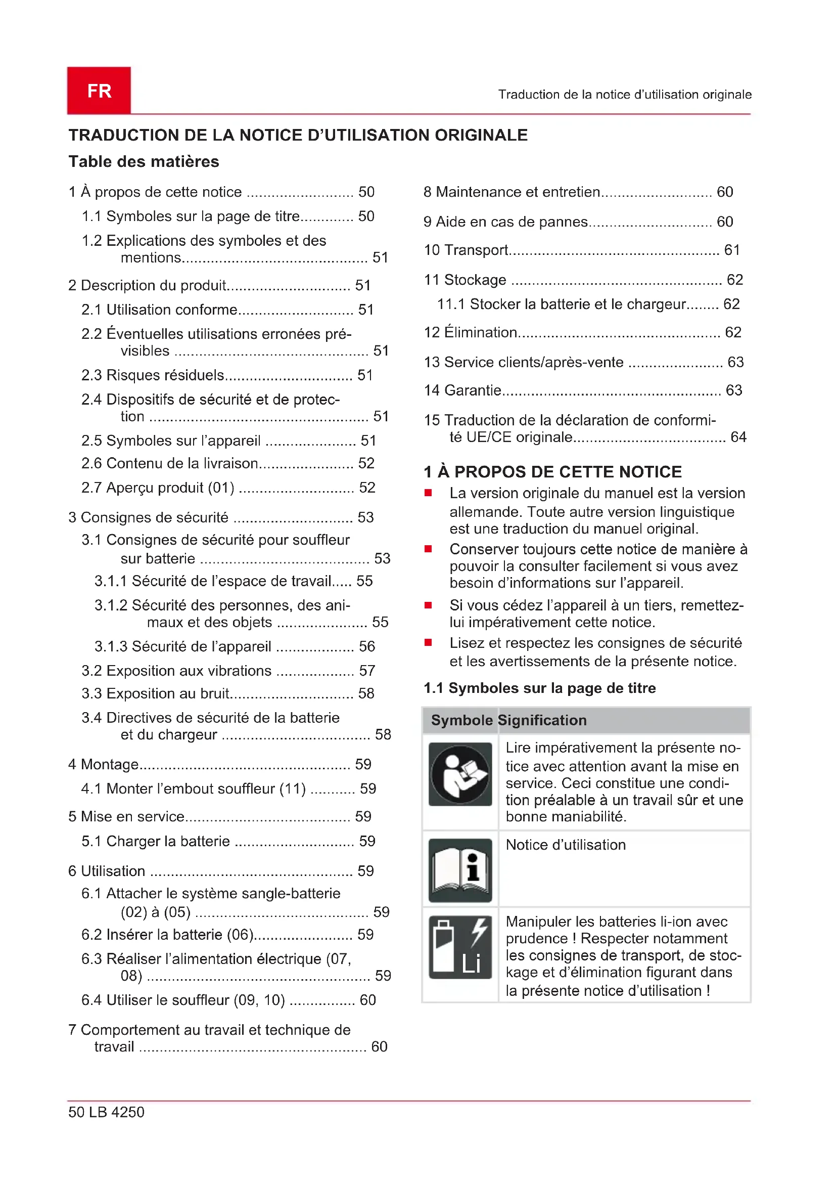 Symbole Signification Une prudence particulière est re- quise lors de la manipulation! Lire la notice d’utilisation avant la mise en service! Danger causé par des projections d'objets ! Éloigner les tierces personnes de la zone à risques!FR 52 LB 4250 Description du produit Symbole Signification Ne pas mettre la main dans la souf- flante! Risque lié à des composants en mouvement. Lire la présente notice d’utilisation avant les travaux de maintenance. Porter une protection oculaire et au- ditive! Protéger l’appareil de la pluie et de l’humidité.