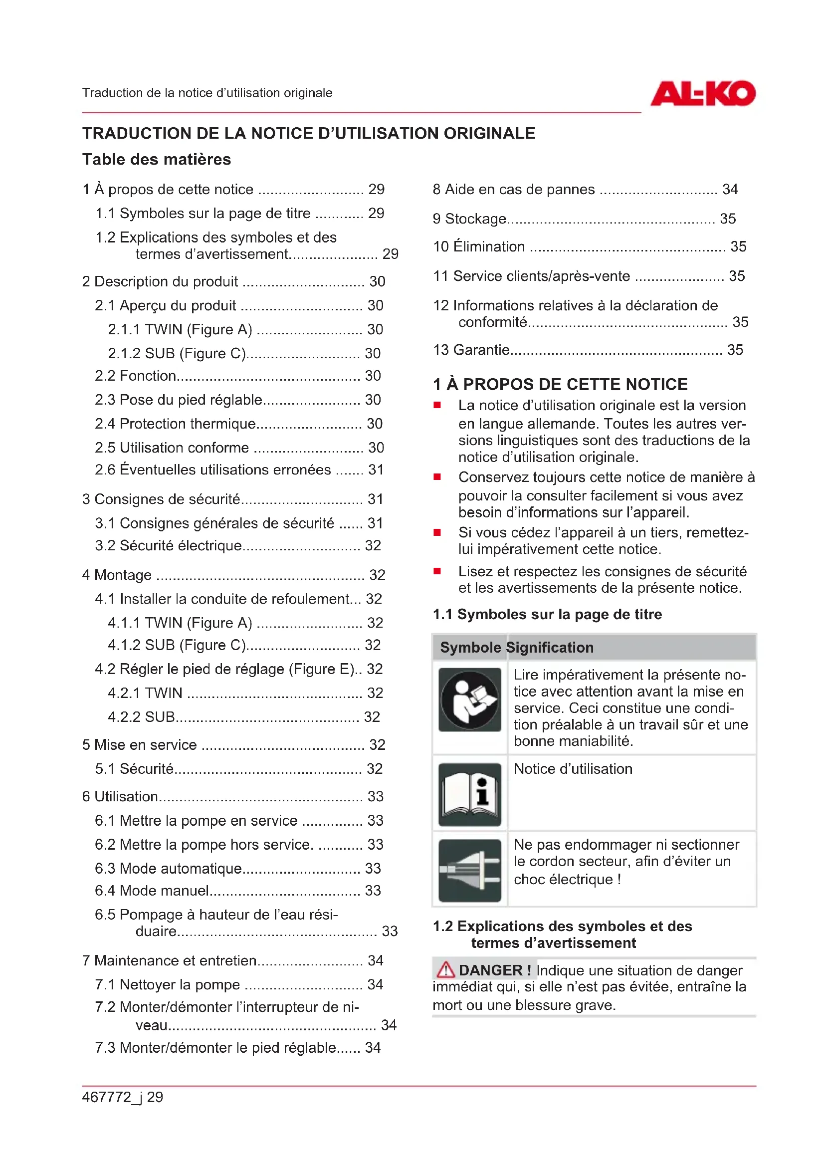 1.1 Symboles sur la page de titre ............ 29