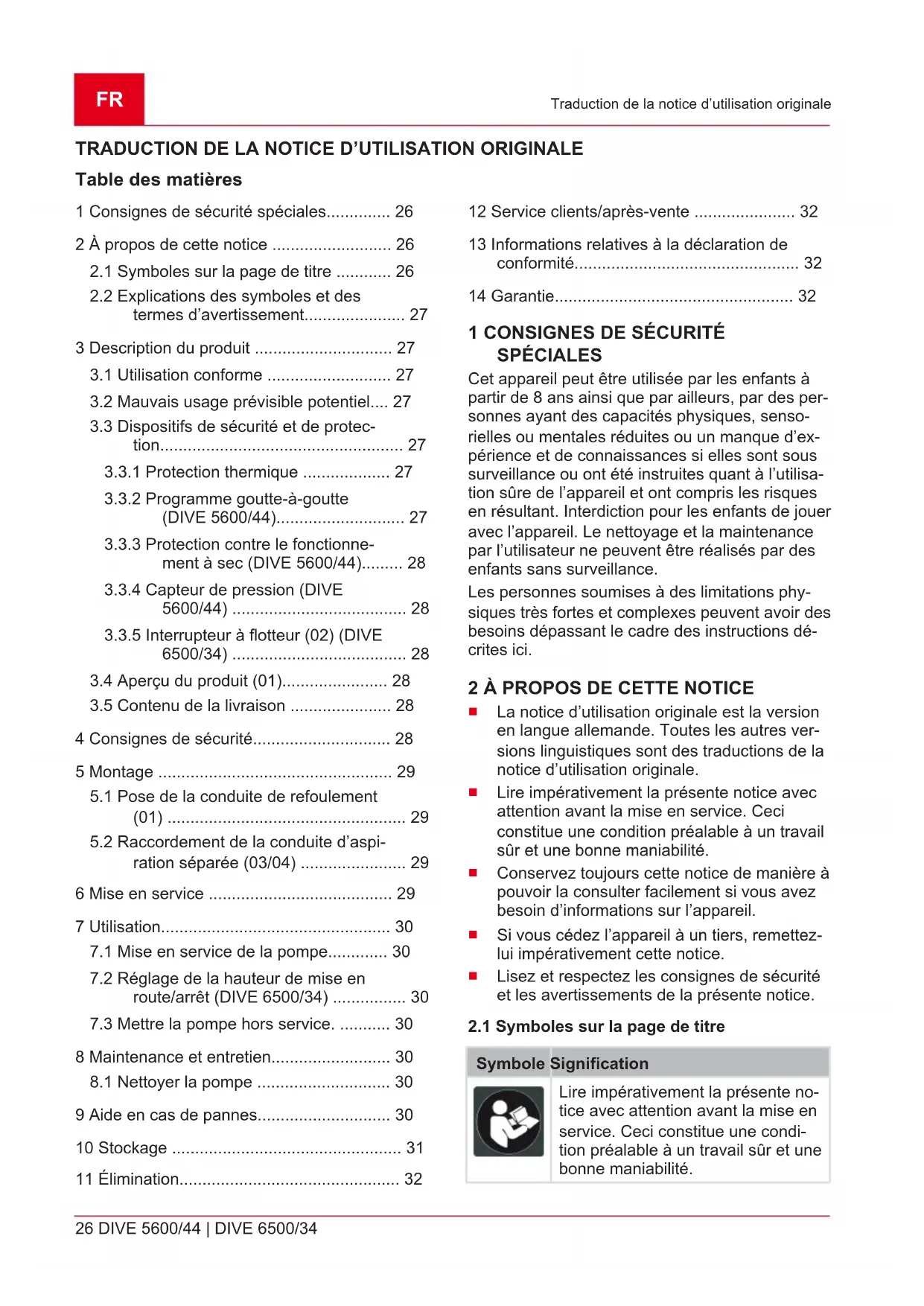 5600/44) Un programme goutte à goutte est activé afin que la pompe ne s'arrête pas prématurément lors du pompage de très petites quantités d'eau (par exemple, des gouttes dans le tuyau). Pour cela, 7 tentatives de démarrage sont effec- tuées en 150 secondes. Puis, la pompe s'arrête. La procédure se répète après un court laps deFR 28 DIVE 5600/44 | DIVE 6500/34 Consignes de sécurité temps. Si d'autres tentatives de démarrage (es- pacées d’une heure) échouent, la pompe s’ar- rête. La fiche d'alimentation électrique doit être dé- branchée et rebranchée pour redémarrer la pompe.