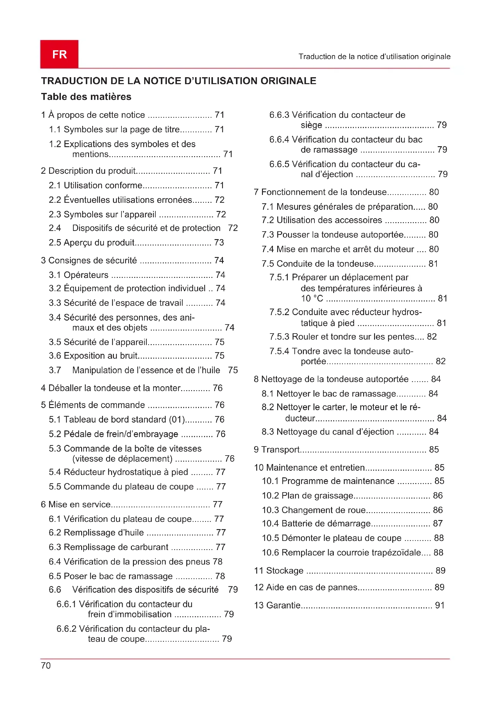 nal d’éjection ................................ 79 7 Fonctionnement de la tondeuse................ 80