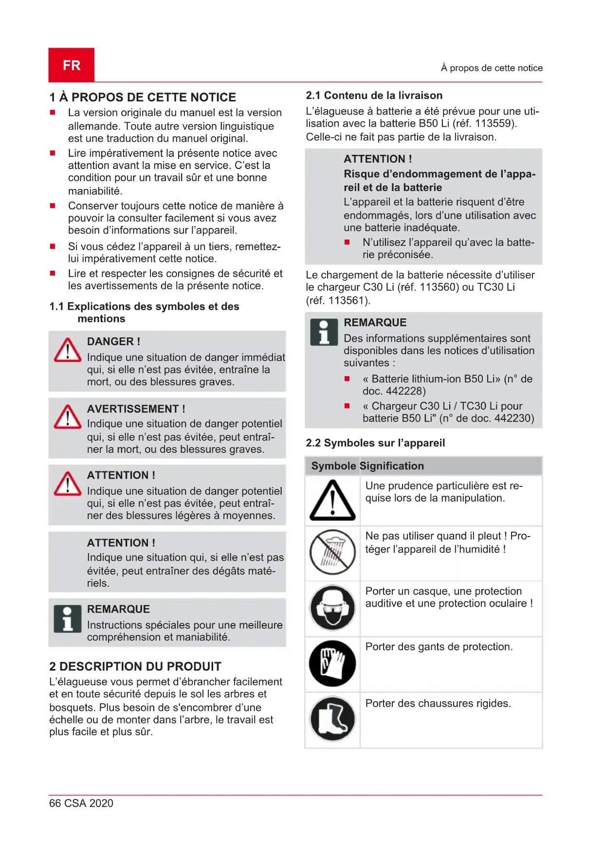 L’élagueuse à batterie a été prévue pour une uti- lisation avec la batterie B50 Li (réf. 113559). Celle-ci ne fait pas partie de la livraison. ATTENTION! Risque d’endommagement de l’appa- reil et de la batterie L’appareil et la batterie risquent d’être endommagés, lors d’une utilisation avec une batterie inadéquate.