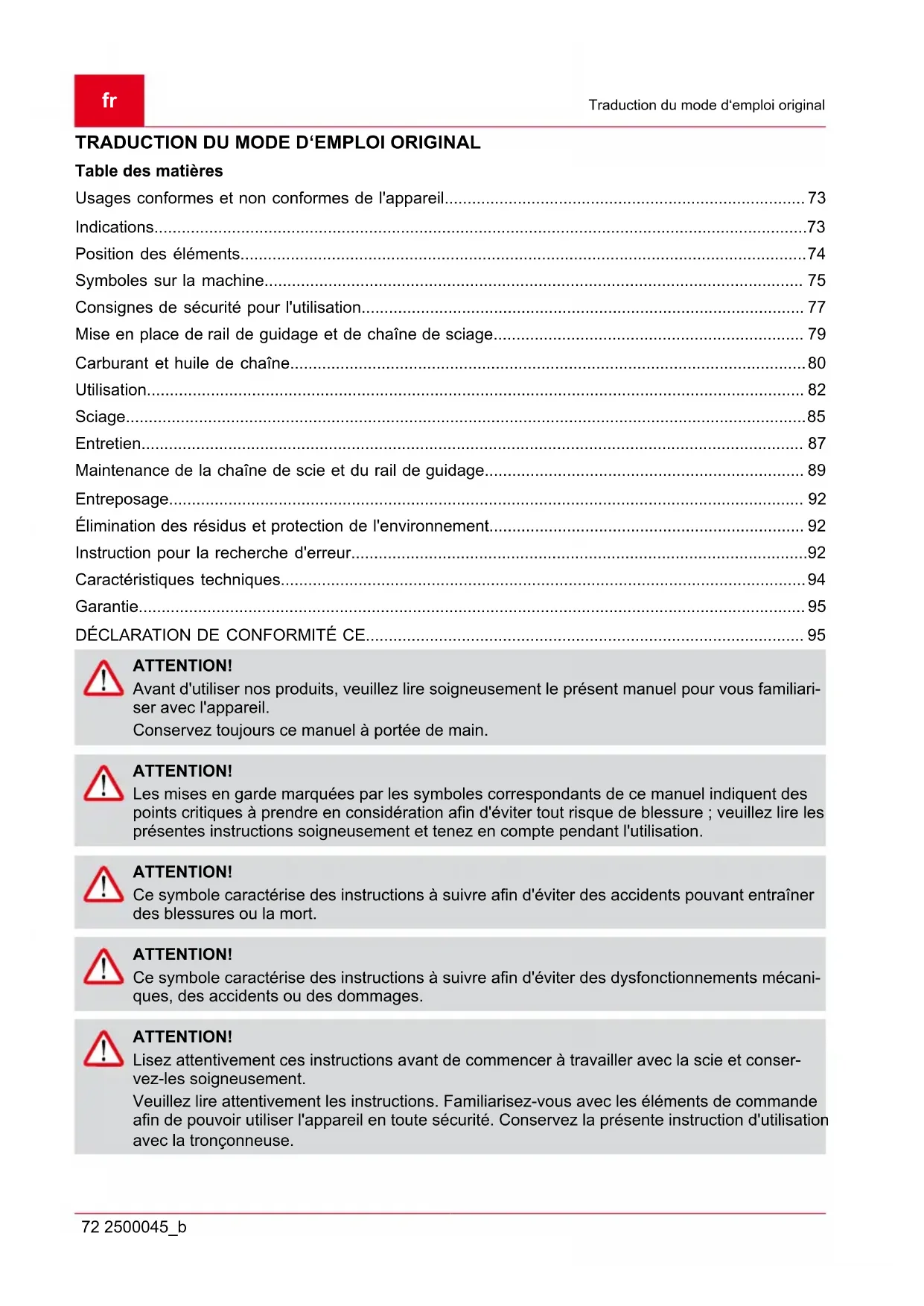 - DÉCLARATION DE CONFORMITÉ CE ATTENTION! Avant d'utiliser nos produits, veuillez lire soigneusement le présent manuel pour vous familiari- ser avec l'appareil. Conservez toujours ce manuel à portée de main. ATTENTION! Les mises en garde marquées par les symboles correspondants de ce manuel indiquent des points critiques à prendre en considération afin d'éviter tout risque de blessure ; veuillez lire les présentes instructions soigneusement et tenez en compte pendant l'utilisation. ATTENTION! Ce symbole caractérise des instructions à suivre afin d'éviter des accidents pouvant entraîner des blessures ou la mort. ATTENTION! Ce symbole caractérise des instructions à suivre afin d'éviter des dysfonctionnements mécani- ques, des accidents ou des dommages. ATTENTION! Lisez attentivement ces instructions avant de commencer à travailler avec la scie et conser- vez-les soigneusement. Veuillez lire attentivement les instructions. Familiarisez-vous avec les éléments de commande afin de pouvoir utiliser l'appareil en toute sécurité. Conservez la présente instruction d'utilisation avec la tronçonneuse.Traduction du mode d‘emploi original 2500045_b 73 ATTENTION! Risque de lésions de l'ouïe ! Dans des conditions de fonctionnement normales, l'utilisateur de l'appareil peut être soumis à un niveau sonore de 80 dB(A) ou plus. La tronçonneuse est à saisir de la main droite au niveau de la poignée arrière et de la main gauche au niveau de la poignée avant. ATTENTION! Protection contre le bruit ! Lors de l'utilisation de l'appareil, les consignes locales sont à respecter. USAGES CONFORMES ET NON CONFORMES DE L'APPAREIL. La tronçonneuse est prévue pour scier des troncs d'arbres, des palettes, et pour scier des branches selon la longueur de coupe. Elle ne doit être employée que pour le travail du bois. Pendant son utilisation, une protection individuelle (PSA) suffisante est nécessaire. Tout autre utilisation comme par ex. le soin professionnel à l'intérieur des arbres est expressément exclue. Pour les dommages ou les blessures causées par une erreur de manipulation, la responsabilité incombe à l'utilisateur / l'usager et pas au fabricant. Seules les chaînes de tronçonnage et les combinaisons de guides-chaîne citées dans la notice d'utilisation, doivent être utilisées. Pour un usage conforme, il est nécessaire de respecter les consignes de sécurité ainsi que les indications d'utilisation du mode d'emploi. Toute personne utilisant l'appareil doit être familiarisée avec celui-ci et être consciente du risque encouru. En outre, les prescriptions de prévention des accidents sont à prendre impérativement en considération. Les consignes en matière de médecine et de sécurité du travail sont également à respecter. En cas de modifications de l'appareil toute responsabilité du fabricant est annulée pour les dommages pouvant en découler ainsi que la garantie de l'appareil. Cet appareil est destiné à un usage privé dans le domaine du jardinage. AVERTISSEMENT! Veuillez vous conformer SVP aux consignes nationales pour l'usage des tronçonneuses ! (pro- tection au travail, environnement) INDICATIONS Même lors d'un usage conforme de l'appareil, il n'est pas possible d'exclure un risque résiduel. Le type et la construction de l'appareil font que les risques suivants ne peuvent être écartés : contact avec la partie non protégée de la chaîne de coupe (coupures) mouvements soudains et inattendus du guide-chaîne (coupures) pertes d'audition suite au refus de porter la protection auditive prescrite inhalation de particules nocives et de gaz d’échappement contact de la peau avec l'essence nuisance due au bruit. Un certain niveau de bruit de la machine ne peut être évité. La nuisance sonore, dans le domaine public, doit avoir fait l'objet d'une autorisation et être limitée dans le temps. Les pauses doivent être respectées et le temps de travail peut faire l'objet de restrictions. Une pro- tection auditive adaptée doit être portée par l'opérateur et les personnes travaillant à proximité.fr Position des éléments 74 2500045_b Vibrations. Mise en garde: le niveau réel de vibration pendant le fonctionnement de la tronçonneuse peut être différent de l'information contenue dans le manuel ou les instructions du fabricant. La raison de cela peut être l'un des facteurs suivants qui doivent être pris en compte avant et pendant l'utilisation : respect des instructions d'utilisation de la tronçonneuse opération de coupe et traitement des débris de coupe usage conforme et état de la tronçonneuse niveau d'affûtage et état de l'outil de coupe montage en option de poignées résistantes aux vibrations et fixation de ces poignées sur le boîtier de la tronçonneuse si, après usage de la machine, vous avez une sensation anormale ou constatez une coloration de la peau des mains, accordez-vous une pause adaptée. Sans pauses, un syndrome des vibrations main- bras peut apparaître. p. 95