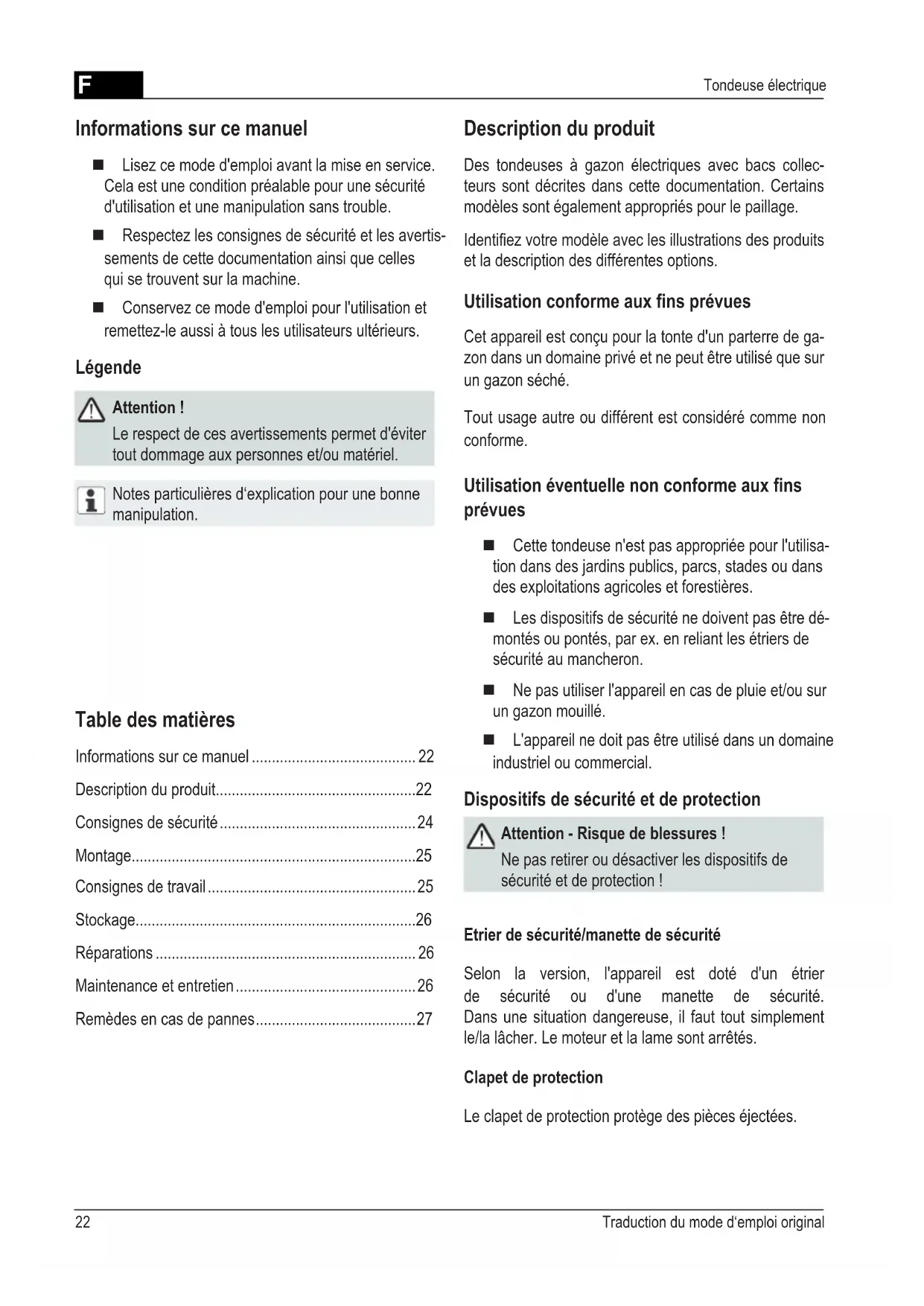 - Tondeuse électrique Table des matières Informations sur ce manuel p. 22