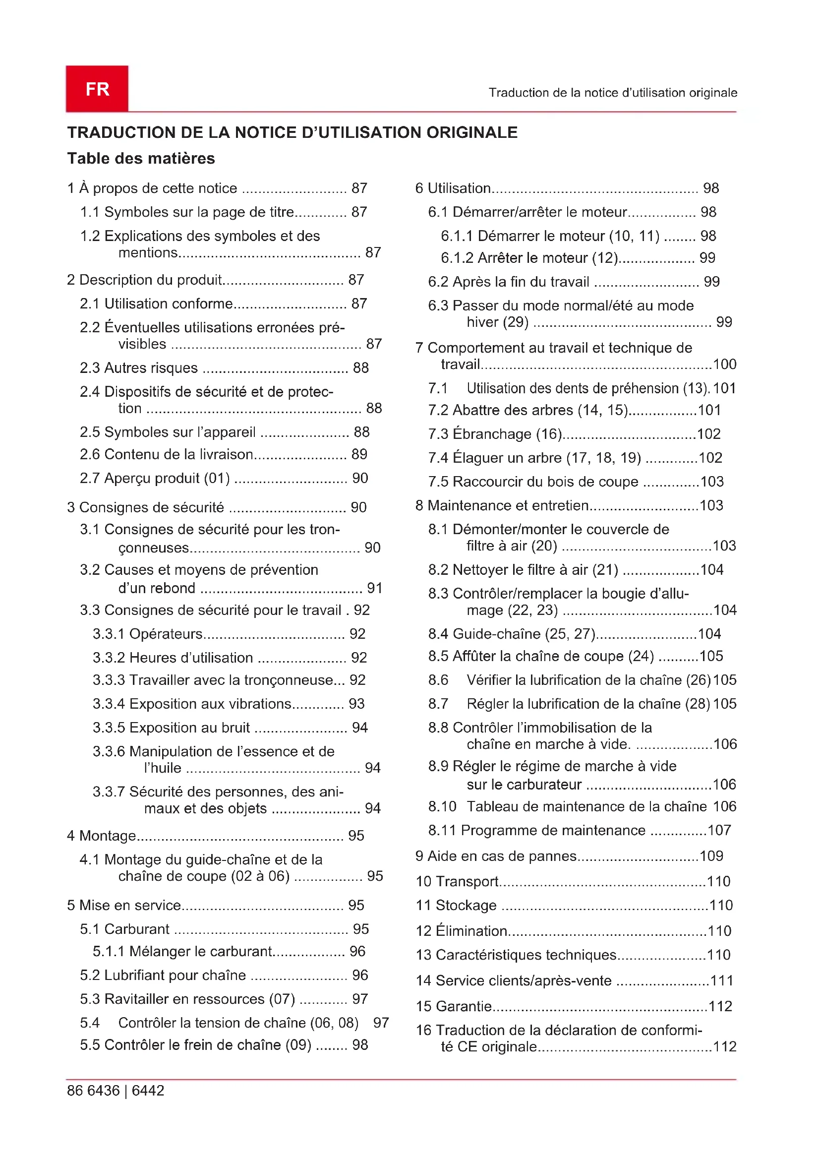 N° Pièce 1 Guide-chaîne 2 Chaîne coupante 3 Tronçonneuse thermique 4 Cache de protection pour guide-chaîne 5 Lime 6 Tournevis 7 Clé mixte 8 Notice d’utilisationFR 90 6436 | 6442 Consignes de sécurité