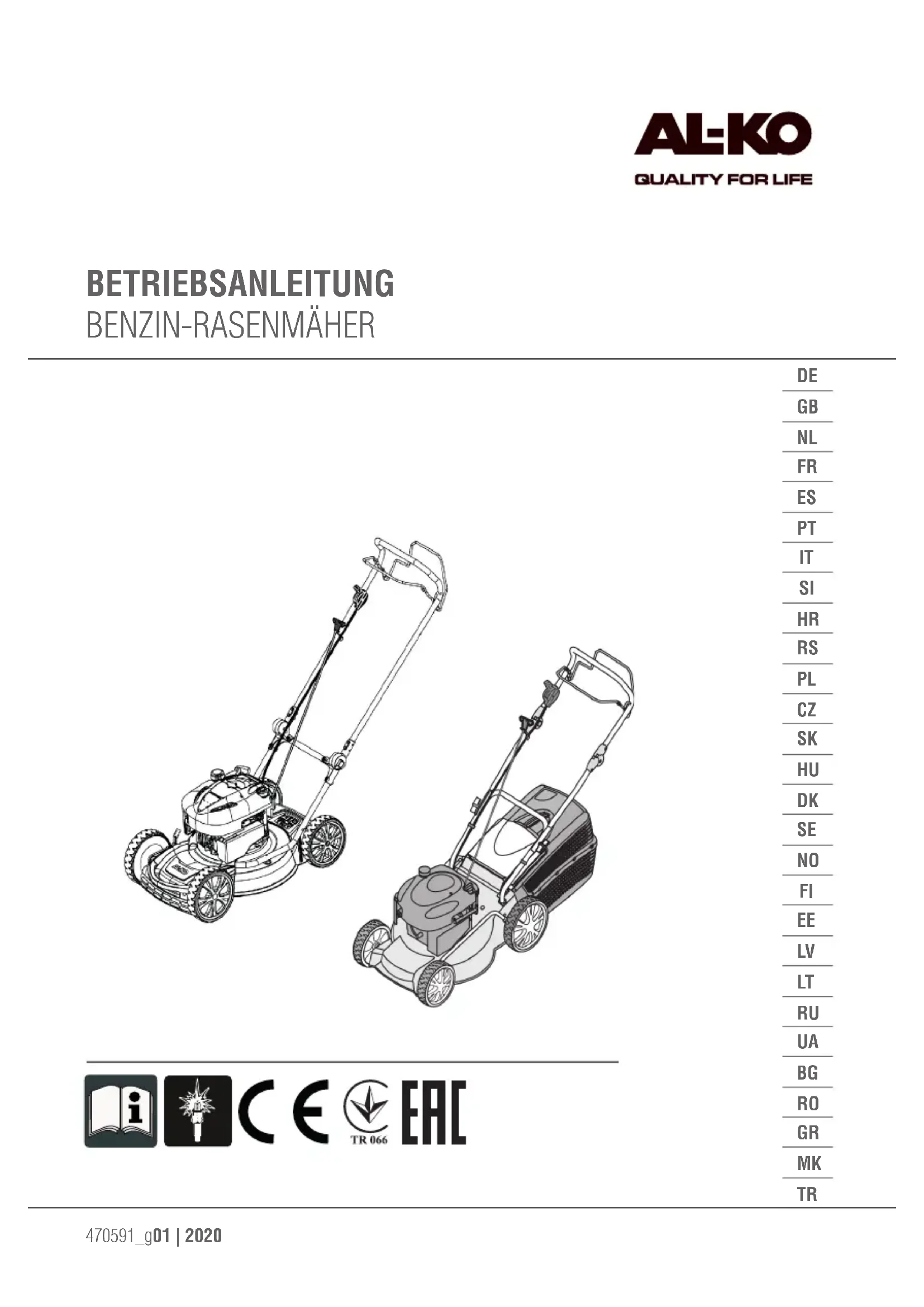 - Garantie Informations sur ce manuel Lire ce mode d'emploi avant la mise en service. C'est une condition préalable pour une sécurité d'utilisation et une manipulation sans problèmes. Avant l'utilisation, familiarisez-vous avec les élé- ments de commande et l'utilisation de la machine. Respecter les consignes de sécurité et les avertissements de cette documentation ainsi que celles qui se trouvent sur la machine. Conserver ce mode d'emploi pour l'utilisation et le remettre aussi à tous les utilisateurs ultérieurs. Légende Attention ! Le respect de ces avertissements permet d'éviter tout dommage aux personnes et/ou matériel. Notes particulières d'explication pour une bonne manipulation. L'icône de l'appareil-photo vous renvoie aux illustrations. Description du produit Cette document décrit différents modèles de tondeuses à gazon à essence. Certains modèles sont équipés d'un bac à herbe et/ou sont également compatibles pour le hachage. Identiezvotremodèleàl'aidedesimagesduproduitet de la description des différentes options. Utilisation conforme aux ns prévues Cet appareil est conçu pour tondre un gazon dans le domaine privatif et ne doit être utilisé que sur de l'herbe sèche. Une utilisation différente ou une utilisation dépassant ce cadre n'est pas conforme. Utilisation incorrecte possible Cette tondeuse à gazon n'est destinée à être utilisée dans les installations ouvertes au public, les parcs, les installations sportives ainsi que dans l'agriculture et l'exploitation forestière Les dispositifs de sécurité ne doivent pas être démontés ni shuntés Ne pas utiliser l'appareil par temps de pluie ou sur de l'herbe mouillée L'utilisation de la machine dans un domaine industriel est interdite Dispositifs de sécurité et de protection Attention - Risque de blessure ! Ne pas mettre les dispositifs de sécurité et de protection hors service ! Barre de sécurité L'appareil est équipé d'une barre de sécurité. En cas de danger, relâcher la barre de sécurité. Appareils sans embrayage de lame : La lame de coupe est arrêtée Le moteur est coupé Appareils sans embrayage de lame : La lame de coupe est arrêtée Le moteur continue à tournerFR 41470 591_g 1 Câble de démarrage 7 Réglage de la hauteur de coupe* 2 Transmission roues* 8 Transmission Vario 3 Barre de sécurité 9 Notice d'instruction 4 Indicateur de niveau* 10 Insert d'éjection* 5 Voletdéecteur* 11 Volet de fermeture* 6 Bac à herbe* 12 Kit de hachage* p. 50