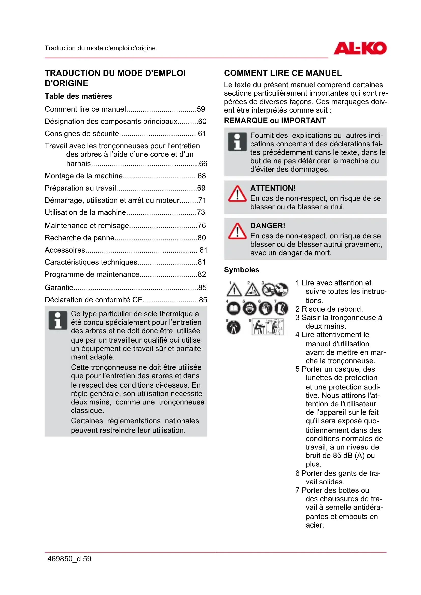 - Déclaration de conformité CE ADVICE Ce type particulier de scie thermique a été conçu spécialement pour l’entretien des arbres et ne doit donc être utilisée que par un travailleur qualifié qui utilise un équipement de travail sûr et parfaite- ment adapté. Cette tronçonneuse ne doit être utilisée que pour l’entretien des arbres et dans le respect des conditions ci-dessus. En règle générale, son utilisation nécessite deux mains, comme une tronçonneuse classique. Certaines réglementations nationales peuvent restreindre leur utilisation. p. 85