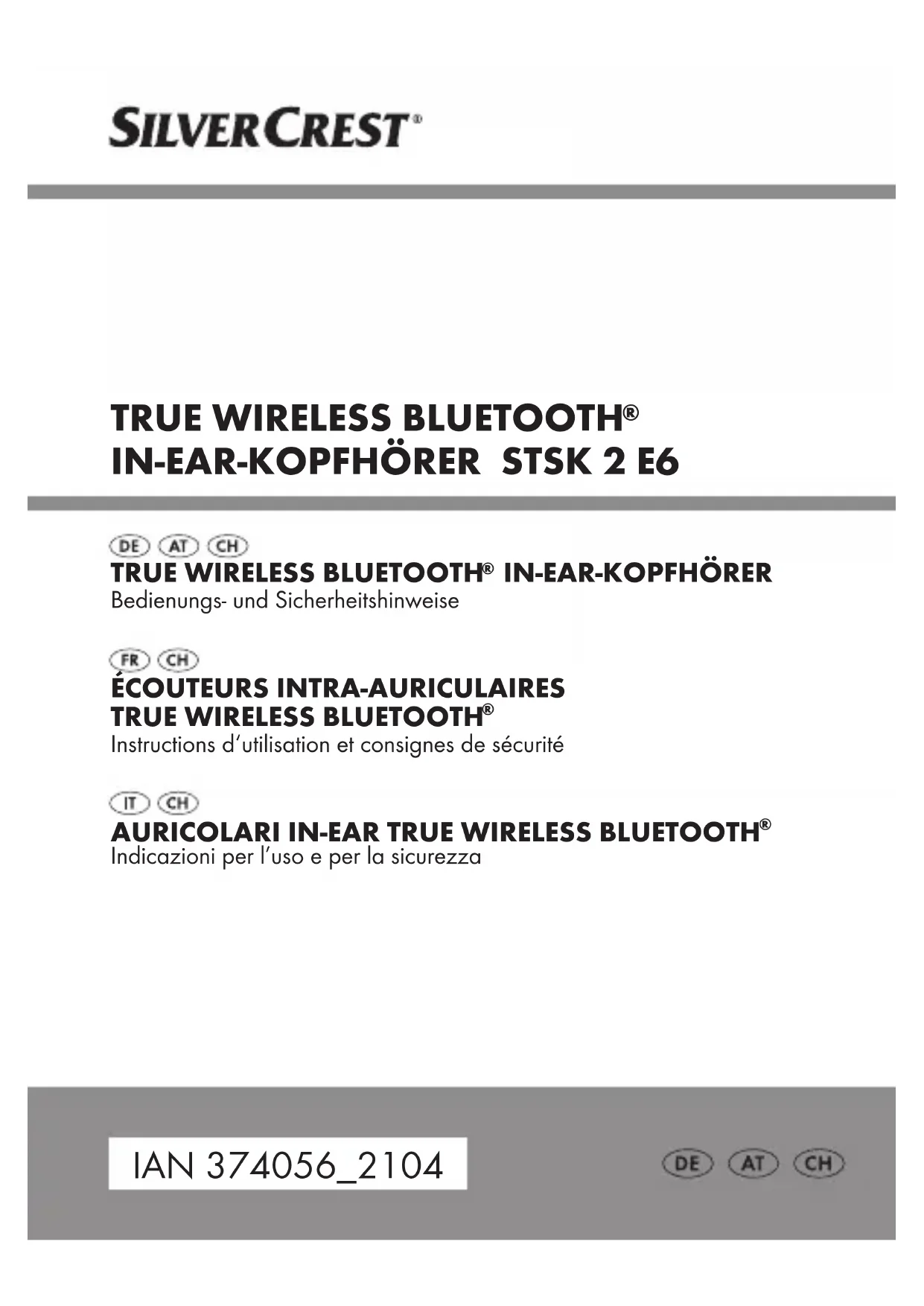 sont des marques déposées de Bluetooth SIG, Inc. et toute utilisation de ces marques par OWIM GmbH & Co. KG est sous licence. «Qi» et le logo Qi sont des marques déposées de Wireless Power Consortium (WPC). La marque et le nom commercial SilverCrest constituent la propriété de leurs propriétaires respectifs. Tous les autres noms ou produits peuvent être des marques ou des marques déposées par leurs propriétaires respectifs. Contenu de l'emballage Après l'ouverture du produit, vérifiez l'exhaustivité de la livraison et si toutes les pièces sont en parfait état. Enlevez tous les matériaux d'emballage avant l'utilisation.56 FR/CH Si vous deviez constater des dégâts ou des pièces manquantes, contactez le revendeur auprès duquel vous avez acheté ce produit. 2x Écouteurs (1 gauche et 1 droit) 1x Boîte de recharge/rangement 1x Câble USB (typeA vers typeC) 2x Coussinets d'oreilles– grands 2x Coussinets d'oreilles– moyens (pré-installés) 2x Coussinets d'oreilles– petits 1x Notice de démarrage rapide 1x Mode d'emploi Vous avez besoin D'une source de tension USB (tension de sortie 5V, courant de sortie minimum 400 mA) ou d'un chargeur compatible Qi avec une puissance de sortie d'au moins 2,5W, et d'un Appareil de lecture compatible Bluetooth ®57FR/CH Description des pièces Avant de lire, dépliez la page des illustrations et familiarisez-vous avec toutes les fonctionnalités du produit. [1] Écouteurs (1 gauche et 1 droit) [2] LED [3] Touche multifonction (touche MF) [4] Capteur optique [5] Microphone [6] Contacts de charge [7] Boîte de recharge/rangement [8] Ports de recharge [9] Voyant du niveau de charge [] Prise de recharge USBC [] Coussinet d'oreille – grand [] Coussinet d'oreille– moyen [] Coussinet d'oreille – petit [] Câble USB (type A vers C) [] Zone de réception Qi [] Mode d'emploi [] Notice de démarrage rapide58 FR/CH Données techniques Boîte de recharge/rangement Tension d'entrée USB-C USB 5 V Courant d'entrée USB-C 400 mA Tension d'entrée sans fil Qi 5 V Puissance de chargement sans fil 2,5 W Distance de chargement sans fil jusqu'au chargeur Qi ≤5 mm Plage de fréquence 128‒181 kHz Puissance radiofréquence maximale transmise (champH) –13,42dBµA/m à une distance de 10 m Accu Li-Ion polymère, 3,7 V, 400 mAh, 1,48 Wh Capacité de charge Jusqu'à 4cycles de recharge complets pour des écouteurs complètement déchargés Durée de recharge de l'accu intégré dans le boîtier de charge/rangement env.3 heures (cycle de chargement complet)59FR/CH Écouteurs Standard wireless Bluetooth