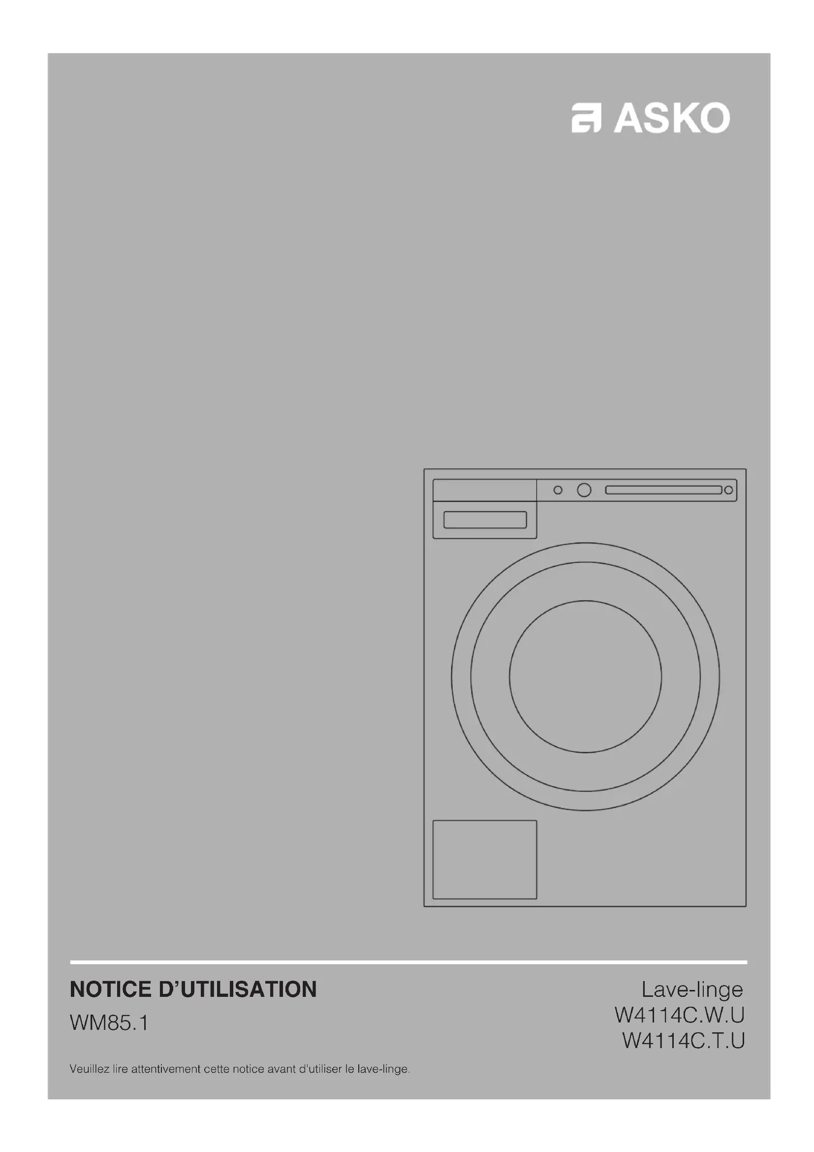 WM85.1 Veuillez lire attentivement cette notice avant d'utiliser le lave-linge. Lave-linge W4114C.W.U W4114C.T.U2 Importantes Mesures de sécurité 3 Description du lave-linge 7 Tiroir à produits lessiviels 7 Avant d'utiliser l'appareil pour la première fois 8 Installation et raccordement 10 Conseils préliminaires au lavage 18 Les étapes du lavage 22 Réglages système 35 Caractéristiques spéciales 38 Nettoyage et entretien 39 Erreurs et guide de dépannage 43 Service et garantie 49 Informations techniques 52 Tableau des programmes et consommations 53 Tableau : mode de lavage/température 55 Tableau des options 56 Mise au rebut 57 Guide d'utilisation rapide 59 Notice originale Voir Guide de mise en service rapide sur la dernière page. SOMMAIRE Les pictogrammes figurant dans cette notice ont les significations suivantes : Informations, conseils, astuces, ou recommandations Attention – risque de brûlure Attention – danger Attention – risque d'incendie Attention – risque de choc électrique Chère Cliente, Cher Client, Nous vous remercions d'avoir choisi ce produit de qualité ASKO. Nous espérons qu'il répondra à vos attentes. Le design scandinave associe des lignes pures, des fonctionnalités adaptées au quotidien et une excellente qualité. Tous nos produits bénéfi cient de ces caractéristiques essentielles qui justifi ent leur succès dans le monde entier. Nous vous recommandons de lire cette notice avant d'utiliser votre appareil pour la première fois. Ce manuel vous indique aussi comment vous pouvez contribuer à la protection de l'environnement.3