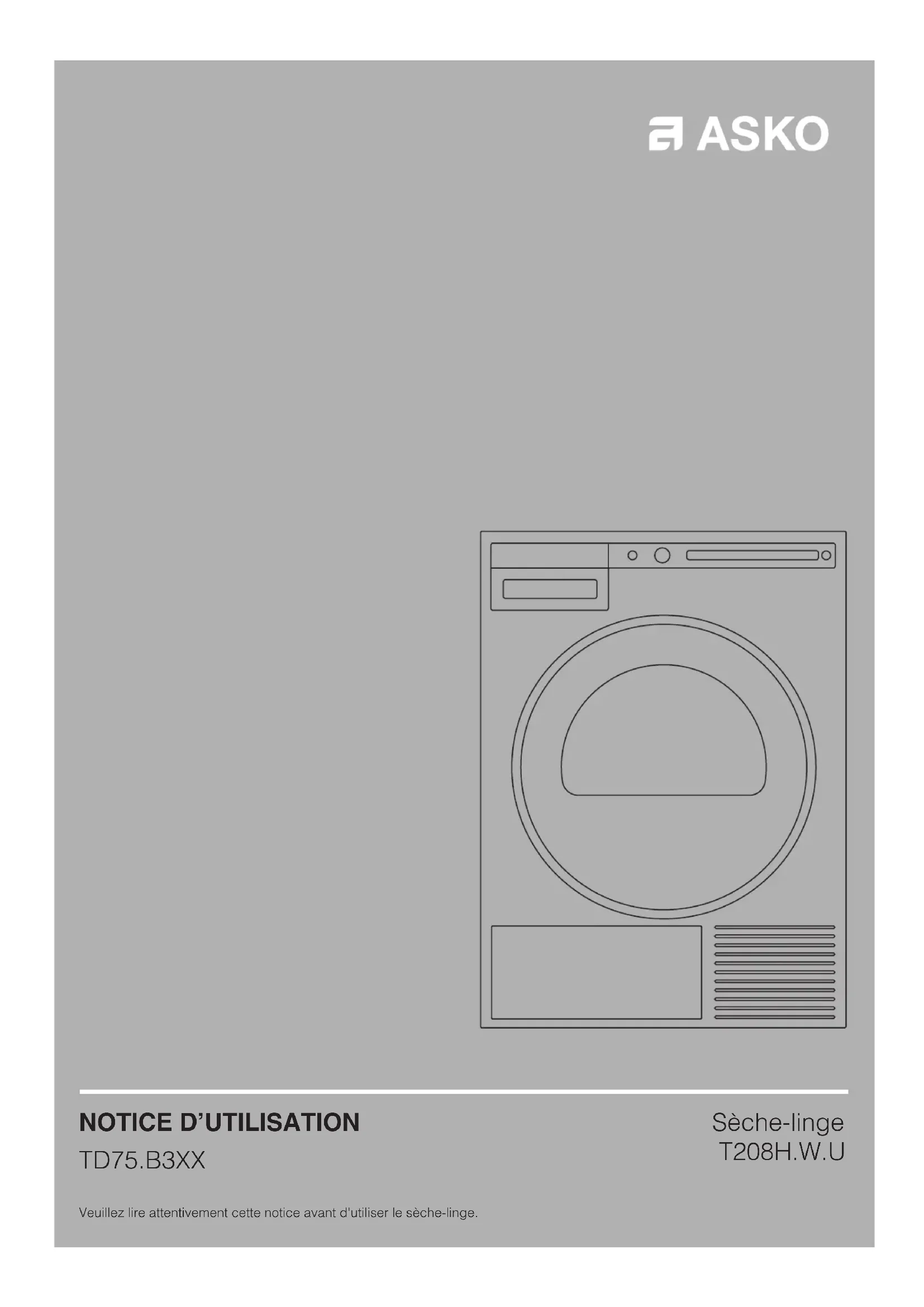 TD75.B3XX Veuillez lire attentivement cette notice avant d'utiliser le sèche-linge. Sèche-linge T208H.W.U2 Importantes mesures de sécurité 3 Description du sèche-linge 7 Avant d'utiliser l'appareil pour la première fois 8 Installation et raccordement 9 Conseils préliminaires au séchage 19 Séchage 22 Réglages système 30 Nettoyage et entretien 34 Erreurs et guide de dépannage 40 Service et garantie 44 Informations techniques 47 Tableau des consommations 48 Mise au rebut 49 Guide d'utilisation rapide 51 SOMMAIRE Les pictogrammes figurant dans cette notice ont les significations suivantes : Informations, conseils, astuces, ou recommandations Attention – risque de brûlure Attention – danger Attention – risque d'incendie Attention – risque de choc électrique Notice originale Voir Guide de mise en service rapide sur la dernière page. Chère Cliente, Cher Client, Nous vous remercions d'avoir choisi ce produit de qualité ASKO. Nous espérons qu'il répondra à vos attentes. Le design scandinave associe des lignes pures, des fonctionnalités adaptées au quotidien et une excellente qualité. Tous nos produits bénéfi cient de ces caractéristiques essentielles qui justifi ent leur succès dans le monde entier. Nous vous recommandons de lire cette notice avant d'utiliser votre appareil pour la première fois. Ce manuel vous indique aussi comment vous pouvez contribuer à la protection de l'environnement.3
