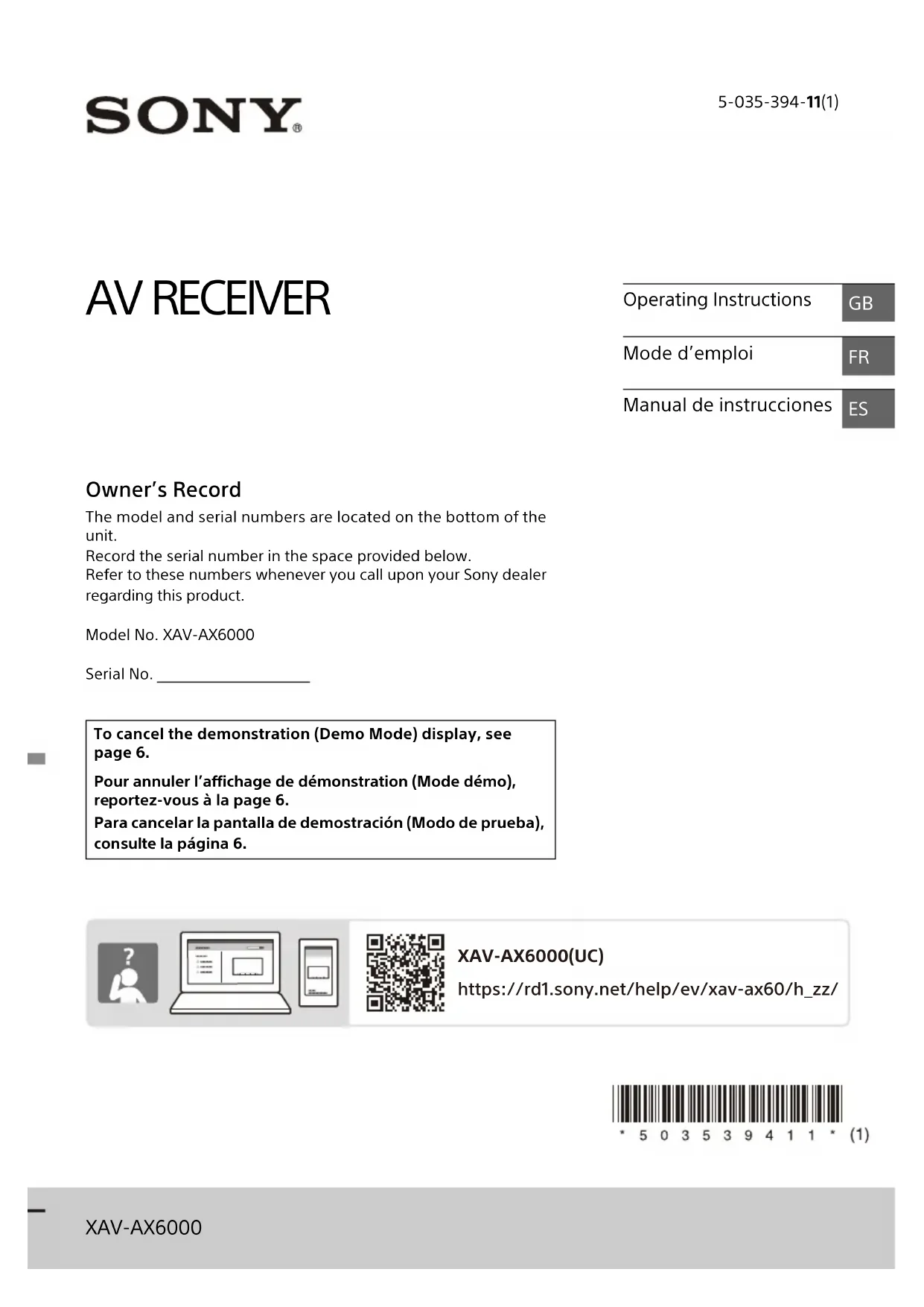 XAVAX6000 - Lecteur/enregistreur de cd SONY - Notice d'utilisation et mode d'emploi gratuit