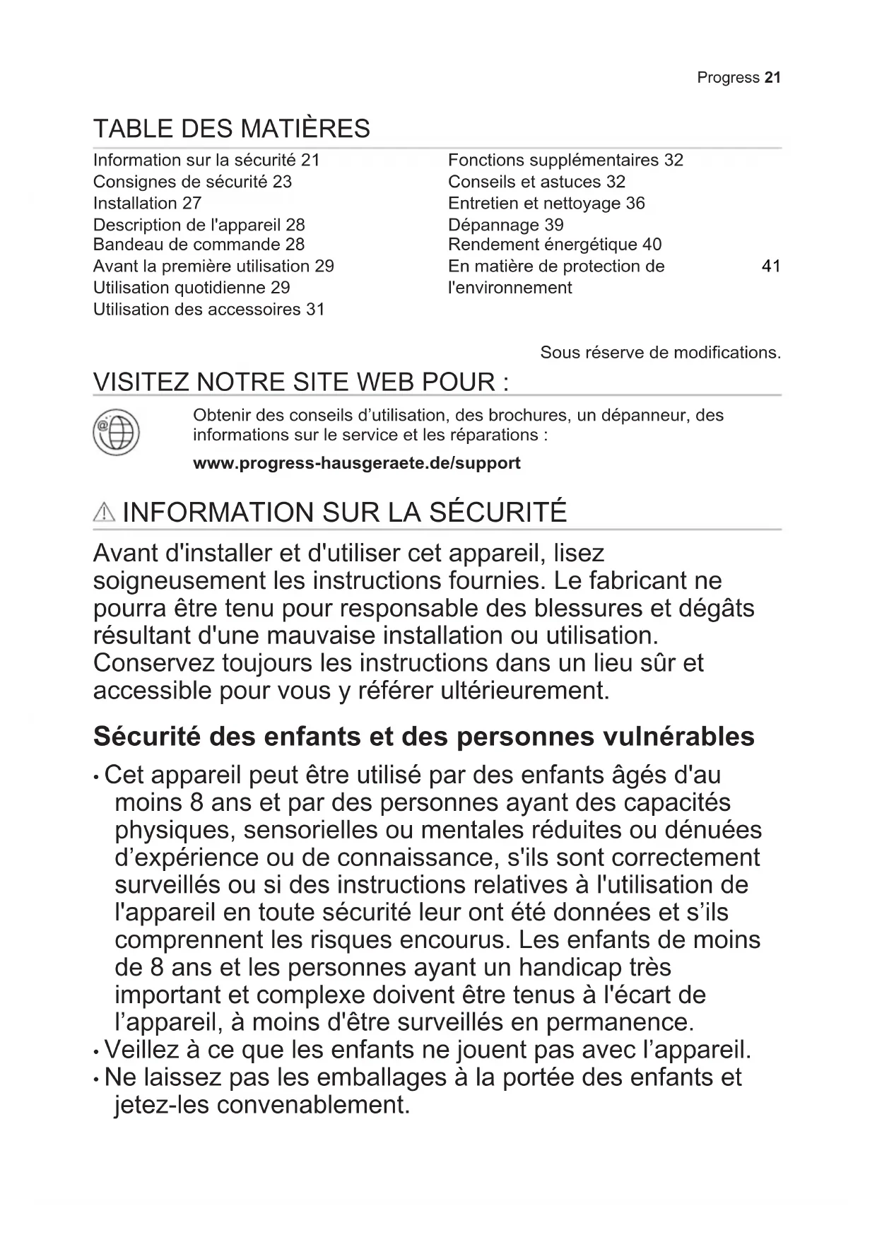 Sous réserve de modifications. VISITEZ NOTRE SITE WEB POUR : Obtenir des conseils d’utilisation, des brochures, un dépanneur, des informations sur le service et les réparations : www.progress-hausgeraete.de/support