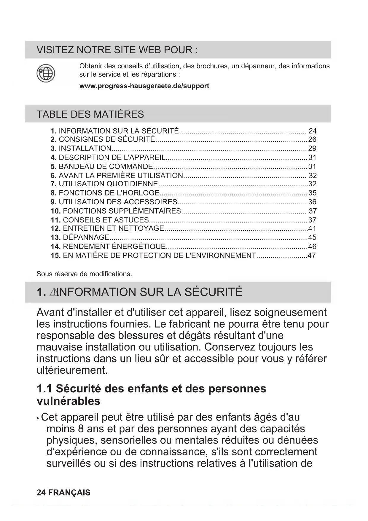 Recyclez les matériaux portant le symbole . Déposez les emballages dans les conteneurs prévus à cet effet. Contribuez à la protection de l'environnement et à votre sécurité, recyclez vos produits électriques et électroniques. Ne jetez pas les appareils portant le symbole avec les ordures ménagères. Emmenez un tel produit dans votre centre local de recyclage ou contactez vos services municipaux. Concerne la France uniquement : FRANÇAIS 47BESUCHEN SIE UNSERE WEBSITE, UM: Anwendungshinweise, Prospekte, Informationen zu Fehlerbehebung, Serviceund Reparatur zu erhalten:www.progress-hausgeraete.de/support INHALTSVERZEICHNIS