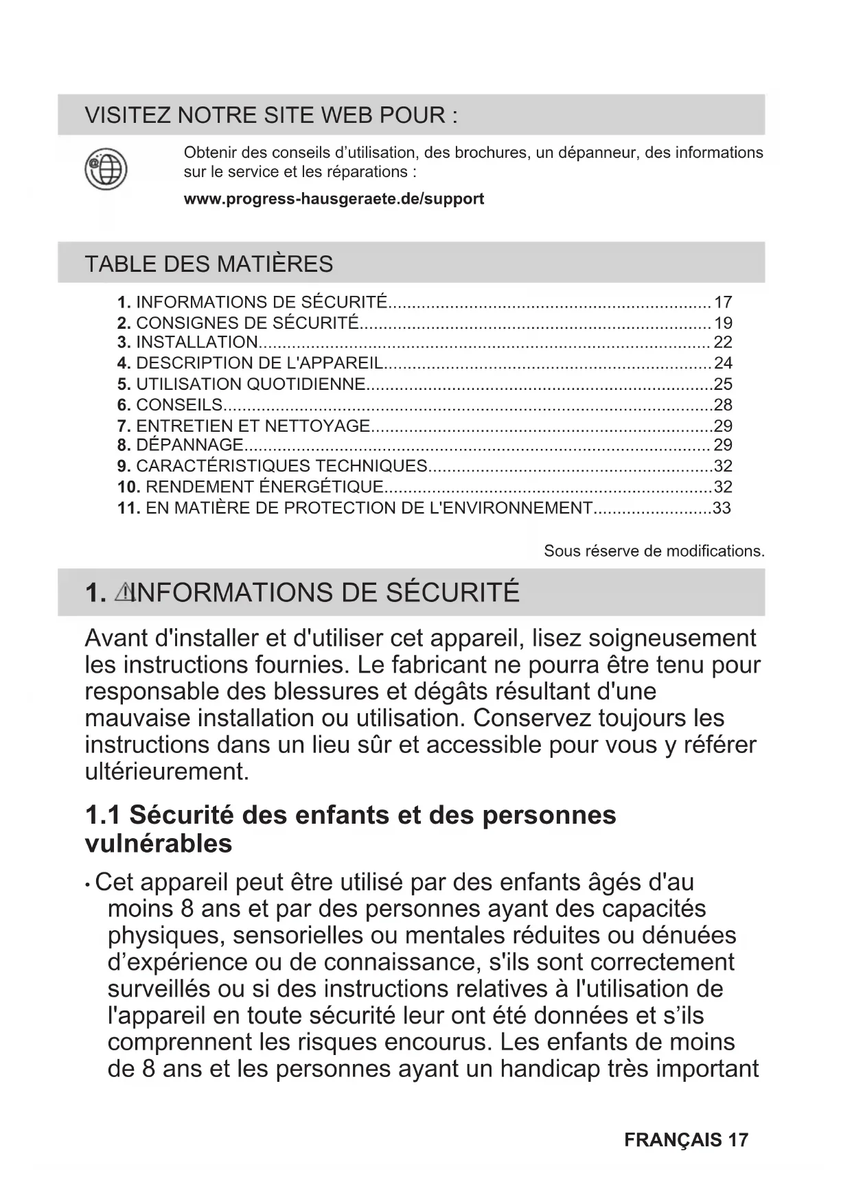 Recyclez les matériaux portant le symbole . Déposez les emballages dans les conteneurs prévus à cet effet. Contribuez à la protection de l'environnement et à votre sécurité, recyclez vos produits électriques et électroniques. Ne jetez pas les appareils portant le symbole avec les ordures ménagères. Emmenez un tel produit dans FRANÇAIS 33votre centre local de recyclage ou contactez vos services municipaux. 34 FRANÇAISBESUCHEN SIE UNSERE WEBSITE, UM: Anwendungshinweise, Prospekte, Informationen zu Fehlerbehebung, Serviceund Reparatur zu erhalten:www.progress-hausgeraete.de/support INHALTSVERZEICHNIS