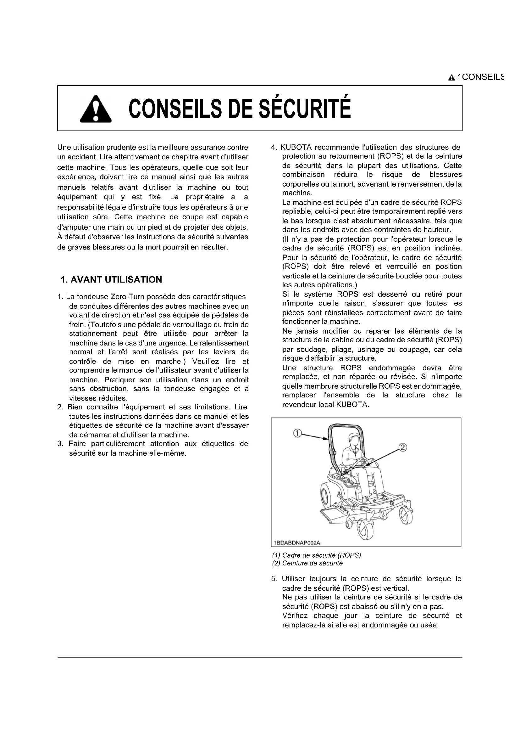 ATTENTION : Indique une situation éminemment dangereuse, des blessures graves ou la mort peuvent survenir si cette situation n'est pas évitée. Indique une situation potentiellement dangereuse, des blessures graves ou la mort peuvent survenir si cette situation n'est pas évitée. Indique une situation potentiellement dangereuse, des blessures mineures ou graves peuvent survenir si cette situation n'est pas évitée. Si les instructions se sont pas suivies des dommages à l'équipement ou à la propriété peuvent survenir. Donne des informations pertinentes. Ce symbole est celui utilisé dans l'industrie pour indiquer un danger. Il est utilisé pour attirer votre attention sur des éléments ou des opérations qui pourraient être dangereux pour vous-mêmes ou d'autres utilisateurs de cette machine. Lisez donc attentivement les consignes qu'il signale. Il est essentiel que vous lisiez les instructions et les réglementations de sécurité avant d'entreprendre l'assemblage ou l'utilisation de cette machine. AVANT-PROPOS Vous êtes maintenant l'heureux propriétaire d'une TONDEUSE ''ZERO TURN'' KUBOTA. Cette machine est le produit de l'étude et de la fabrication de haute qualité KUBOTA. Elle est fabriquée avec les meilleurs matériaux et sous un système de contrôle de qualité très rigoureux, et vous donnera de longues années de service satisfaisant. Pour tirer le meilleur parti de votre machine KUBOTA, lisez attentivement ce manuel. Il vous aidera à vous familiariser avec son fonctionnement et vous y trouverez de nombreux conseils sur l'entretien de la machine. Chez KUBOTA, nous avons pour principe d'appliquer, aussitôt que possible, tous les progrès réalisés grâce à notre recherche. La mise en œuvre immédiate de nouvelles techniques dans la fabrication de certains produits pourra faire que de petites parties de ce manuel soient périmées. Les distributeurs et concessionnaires KUBOTA disposeront cependant des informations les plus récentes. N'hésitez pas à les consulter.CONTENU