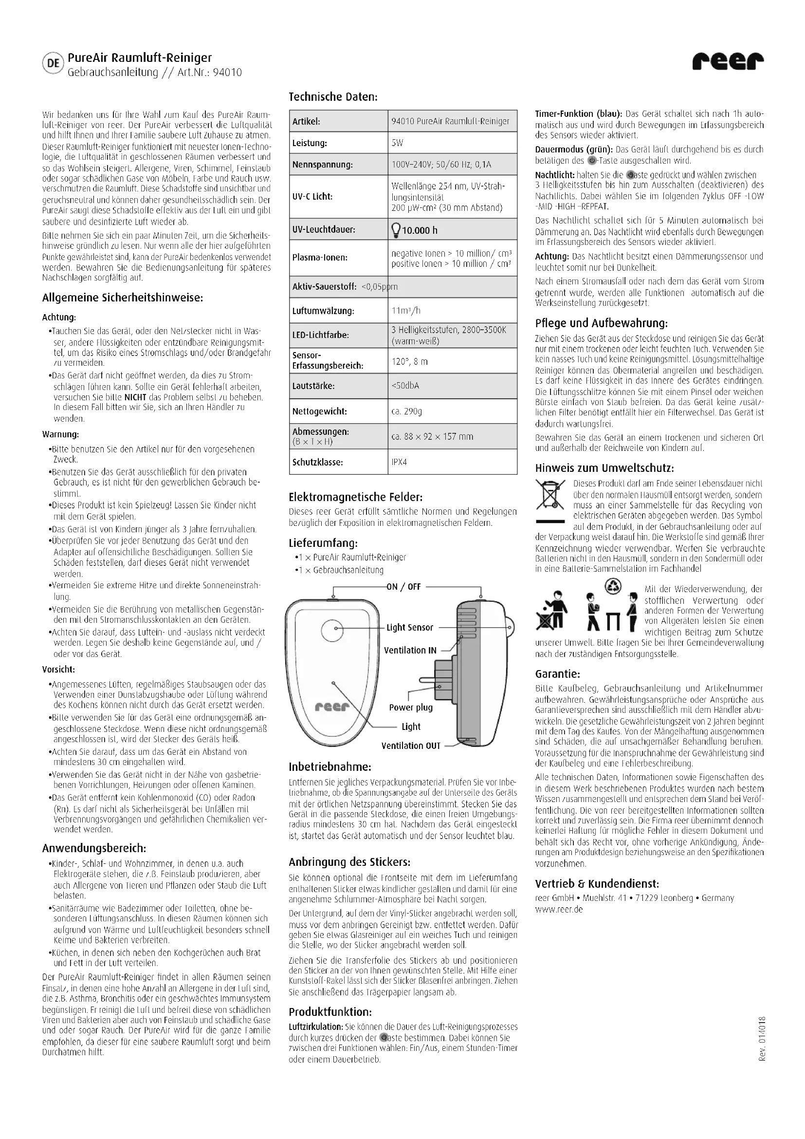 - 1 × Notice d‘utilisation Mise en service : Retirez tous les matériaux d’emballage. Avant la mise en service, vérifiez que la tension indiquée sur la face inférieure de l‘appareil corresponde à la tension du réseau local. Branchez l‘appareil sur une prise appropriée avec un rayon péri- phérique d‘au moins 30 cm. Une fois l‘appareil branché, il démarre automatiquement et le capteur s‘allume en bleu. Fixation de l‘autocollant : La surface sur laquelle l‘autocollant de vinyle doit être fixé doit être nettoyée ou dégraissée avant la fixation. Pour ce faire, appliquez un peu de nettoyant pour vitres sur un chiffon doux et nettoyez l‘endroit où l‘autocollant doit être fixé. Retirez la feuille de transfert de l‘autocollant et placez l‘autocollant à l‘endroit souhaité. L‘autocollant peut être fixé sans bulles à l‘aide d‘une raclette en plastique. Ensuite, enlevez doucement le papier support. Fonctionnement du produit : Circulation d‘air :Vous pouvez déterminer la durée du processus d‘épuration de l‘air en appuyant brièvement sur la touche . Ce faisant, vous pouvez choisir parmi trois fonctions : Marche/Arrêt, minuterie d‘une heure ou fonctionnement continu. Fonction minuterie (bleu) : L‘appareil s‘arrête automatiquement après 1 heure et est réactivé par détection de mouvements. Mode continu (vert) : L‘appareil fonctionne en continu jusqu‘à ce qu‘il s‘arrête lorsque la touche est actionnée. Veilleuse : maintenez la touche enfoncée et sélectionnez parmi 3 niveaux de luminosité jusqu‘à ce que la veilleuse s’éteigne (désactivation). Dans le cycle suivant, sélectionnez OFF -LOW -MID -HIGH -REPEAT. La veilleuse s‘allume automatiquement au crépuscule pendant 5 minutes. La veilleuse est également réactivée par détection de mouvements. Attention : La veilleuse est équipée d‘un capteur crépusculaire et ne s‘allume donc que dans l‘obscurité. En cas de panne de courant ou lorsque l‘appareil est débranché, toutes les fonctions sont automatiquement réinitialisées aux réglages d‘usine. Entretien et rangement : Débranchez l‘appareil de la prise de courant et nettoyez-le uniquement avec un chiffon sec ou légèrement humide. N’utilisez jamais de chiffon mouillé ni de produit nettoyant. Les nettoyants à base de solvants peuvent attaquer et endommager l‘empeigne. Aucun liquide ne doit s’infiltrer à l‘intérieur de l‘appareil. Vous pouvez facilement enlever la poussière des fentes d‘aération à l‘aide d‘un pinceau ou d‘une brosse douce. L‘appareil ne nécessitant pas de filtre supplémentaire, un changement de filtre n‘est pas nécessaire. Par conséquent, l‘appareil ne nécessite aucun entretien. Conservez l’appareil dans un endroit sécurisé et sec et tenez-le hors de la portée des enfants. Informations sur la protection environnementale : À la fin de sa vie, ce produit ne doit pas être jeté avec les ordures ménagères, mais il doit être porté à un point de collecte approprié pour le recyclage des appareils électriques et électroniques. Ceci est indiqué par le symbole sur le produit, dans le mode d’emploi et sur l’emballage. Les matériaux sont recyclables en fonction de leur marquage. Ne jetez pas les piles usagées avec les ordures ménagères, mais portez- les à une station de collecte du commerce spécialisé. Par le recyclage des matières, la réutilisation ou d’autres formes de valorisation des anciens appareils, vous prenez part à la protection de notre environnement. Veuillez vous adresser à l’administration de votre commune pour connaître les centres compétents pour le traitement des déchets. Garantie : Veuillez conserver la preuve d’achat, le mode d’emploi et le numéro d’article. Les droits à la garantie ou les réclamations en vertu de la garantie sont à définir exclusivement avec le commerçant. Les caractéristiques techniques, les informations et les spécificités du produit dans ces pages sont données de bonne foi, et répondent au stade actuel de la technique. Les informations fournies par reer devraient être correctes et fiables. La société reer ne peut cependant assumer aucune responsabilité pour les possibles erreurs dans ce document et elle se réserve le droit de procéder, sans préavis, à des modifications du design ou des caractéristiques du produit. Toute reproduction ou retransmission à tout tiers des informations de ce document, protégé aux termes de la législation sur les droits d’auteur, sous quelque forme que ce soit, graphique, électronique ou mécanique, notamment par photocopie, enregistrement sur bande ou stockage dans un système d’interrogation (même en extraits) nécessite l’autorisation préalable par écrit de la société reer. Distributeur et Service client : reer GmbH • Muehlstr. 41 • 71229 Leonberg • Germany www.reer.de Rev. 014018 PureAir Dispositif d‘épuration de l‘air ambiant Mode d‘emploi // Réf. : 94010
