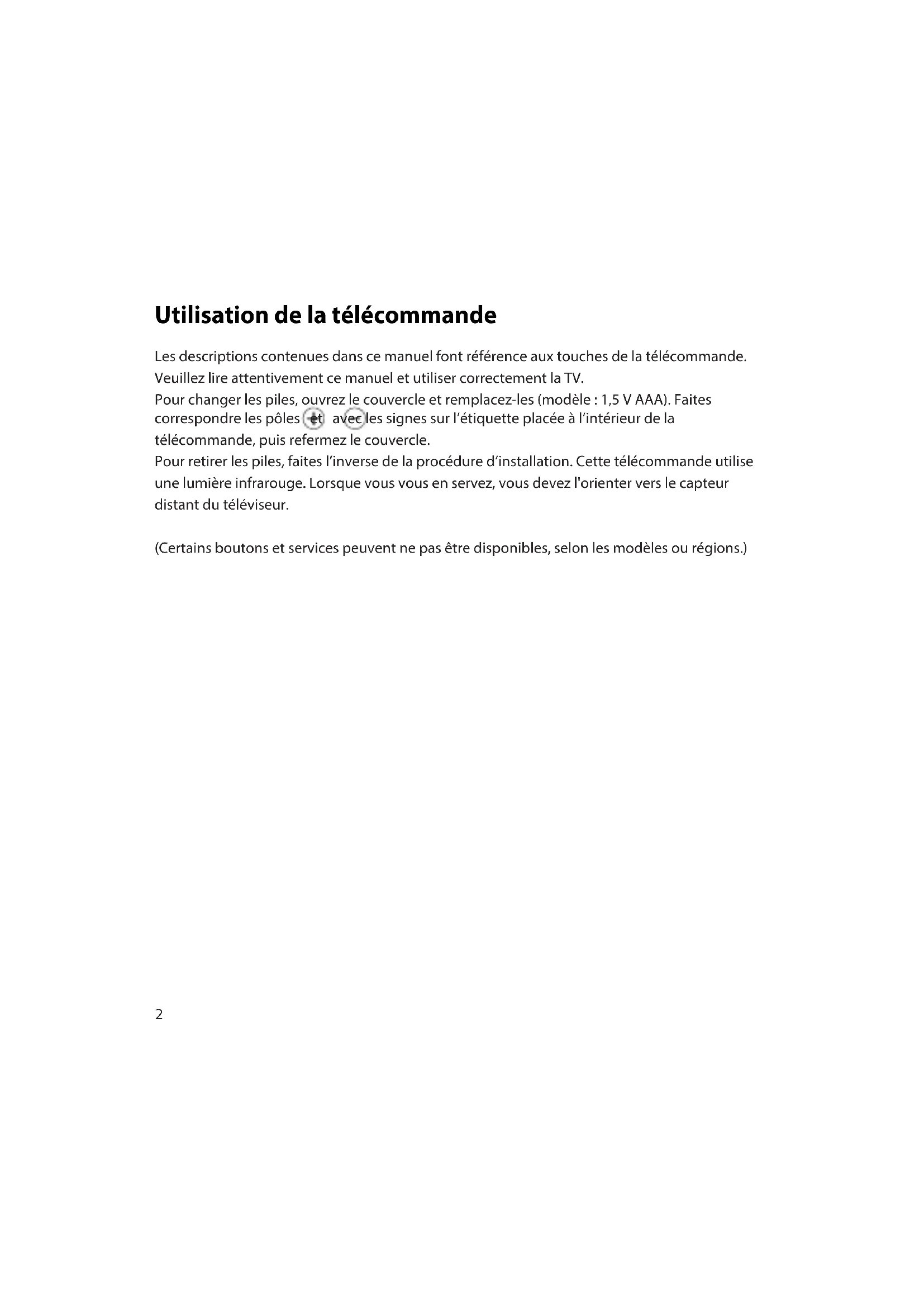 Télécommande standard2 Utilisation de la télécommande Les descriptions contenues dans ce manuel font référence aux touches de la télécommande. Veuillez lire attentivement ce manuel et utiliser correctement la TV. Pour changer les piles, ouvrez le couvercle et remplacez-les (modèle: 1,5VAAA). Faites correspondre les pôles et avec les signes sur l’étiquette placée à l’intérieur de la télécommande, puis refermez le couvercle. Pour retirer les piles, faites l’inverse de la procédure d’installation. Cette télécommande utilise une lumière infrarouge. Lorsque vous vous en servez, vous devez l'orienter vers le capteur distant du téléviseur. (Certains boutons et services peuvent ne pas être disponibles, selon les modèles ou régions.) Pour utiliser la touche, maintenez-la enfoncée pendant plus de 1seconde. (Bouton Marche/Arrêt) Permet d'éteindre ou d'allumer la TV. (Source) Permet de changer la source d’entrée.