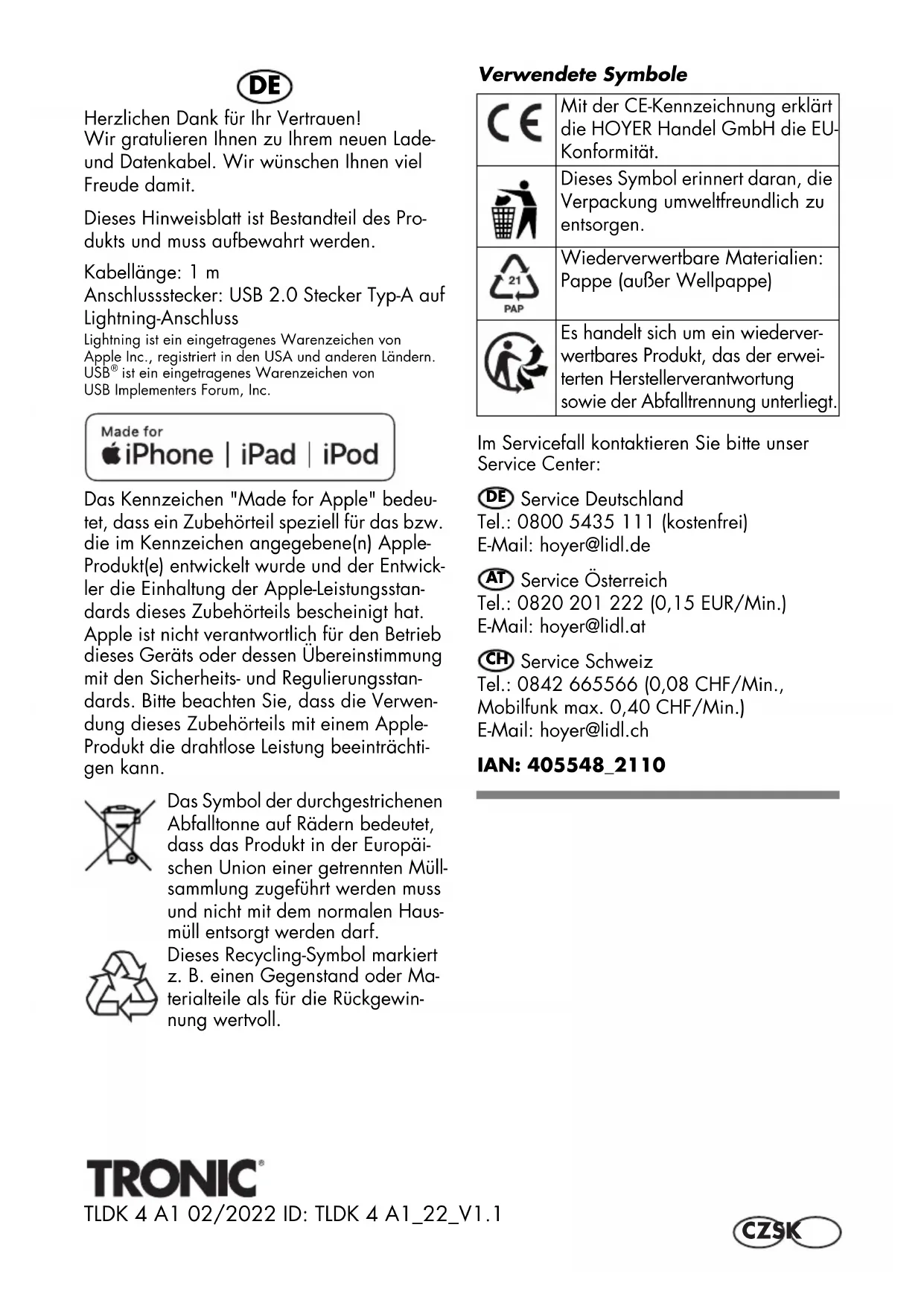 Lieferant / Supplier HOYER Handel GmbH / Kühnehöfe 12 / 22761 Hamburg DEUTSCHLAND / GERMANY 405548_2110_Lightning_USB A_B8__B.fm Seite 3 Mittwoch, 23. Februar 2022 11:40 11Nous vous remercions pour votre confiance ! Nous vous félicitons pour l'achat de votre nou- veau câble de charge et synchronisation. Nous espérons qu'il vous apportera entière satisfac- tion. Cette fiche d'information fait partie inté- grante du produit et doit être conservée. Longueur du câble : 1m Connecteur : USB 2.0 type-A vers Lightning Lightning est une marque déposée d'Apple Inc., enregis-trée aux États-Unis et dans d'autres pays. USB