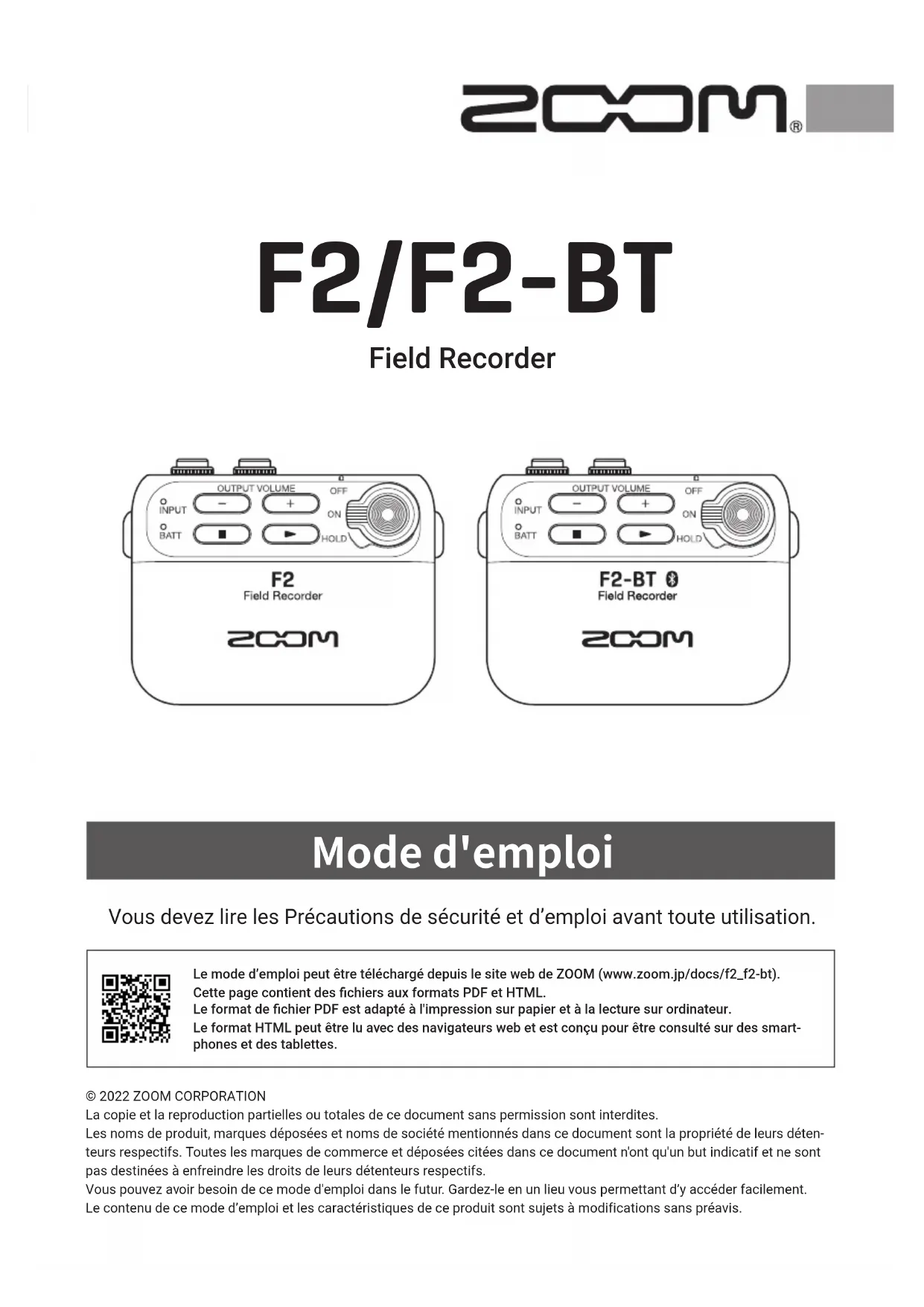 Retrouvez gratuitement la notice de l'appareil F2BT ZOOM au format PDF.