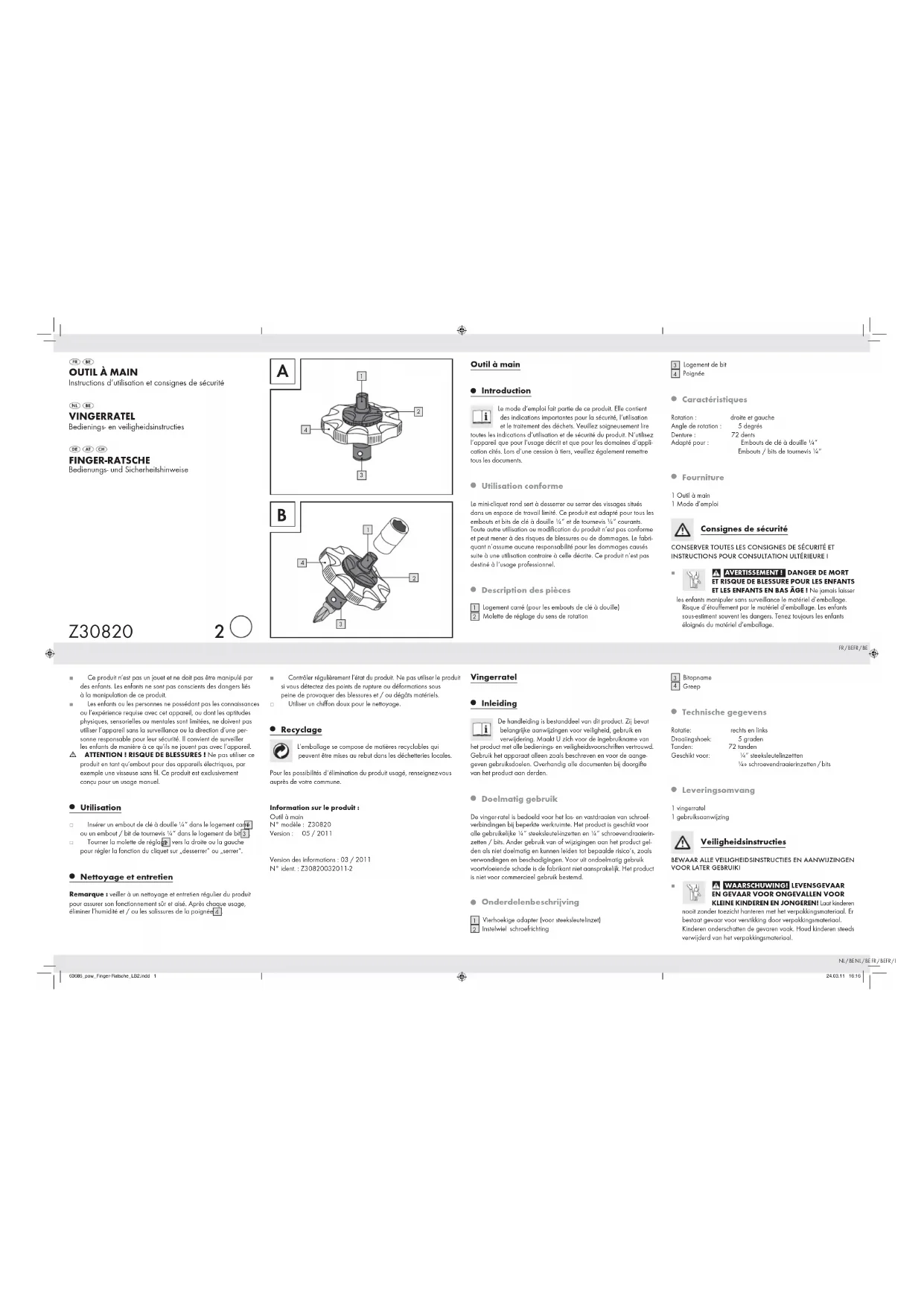Recyclage L’emballage se compose de matières recyclables qui peuvent être mises au rebut dans les déchetteries locales. Pour les possibilités d‘élimination du produit usagé, renseignez-vous auprès de votre commune. Information sur le produit : Outil à main N° modèle : Z30820 Version : 05 / 2011 Version des informations : 03 / 2011 N° ident. : Z30820032011-2