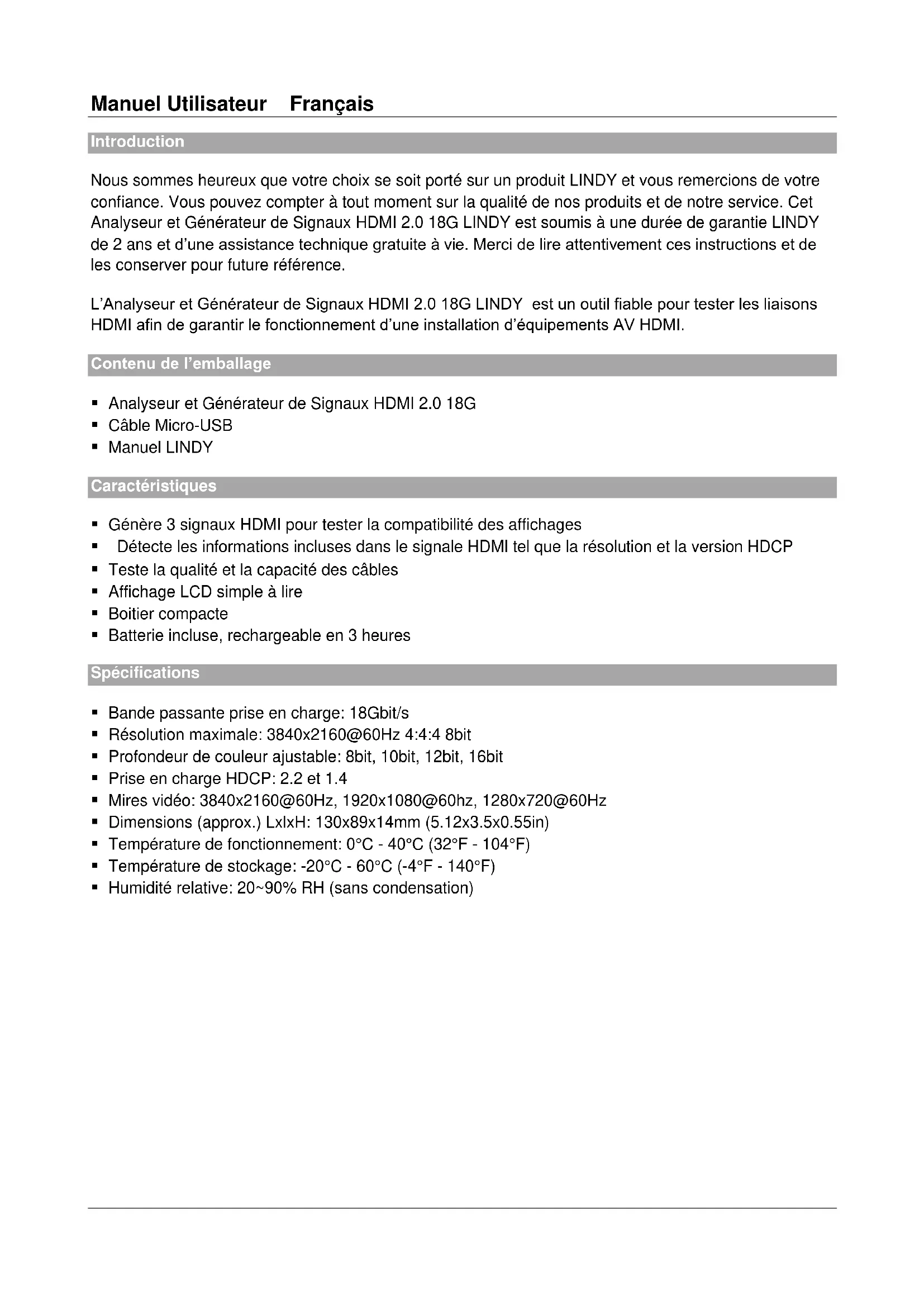 Fehlersuche Nach einer Minute im Leerlauf wird der Analyser automatisch in den Batteriesparmodus wechseln. Drücken Sie irgendeine Taste, um den Analyser zu reaktivieren. Das Gerät wechselt nicht in den Batteriesparmodus, wenn am Eingang eine aktive HDMI-Verbindung anliegt.Manuel Utilisateur Français Introduction Nous sommes heureux que votre choix se soit porté sur un produit LINDY et vous remercions de votre confiance. Vous pouvez compter à tout moment sur la qualité de nos produits et de notre service. Cet Analyseur et Générateur de Signaux HDMI 2.0 18G LINDY est soumis à une durée de garantie LINDY de 2 ans et d’une assistance technique gratuite à vie. Merci de lire attentivement ces instructions et de les conserver pour future référence. L’Analyseur et Générateur de Signaux HDMI 2.0 18G LINDY est un outil fiable pour tester les liaisons HDMI afin de garantir le fonctionnement d’une installation d’équipements AV HDMI. Contenu de l’emballage Analyseur et Générateur de Signaux HDMI 2.0 18G Câble Micro-USB Manuel LINDY Caractéristiques Génère 3 signaux HDMI pour tester la compatibilité des affichages Détecte les informations incluses dans le signale HDMI tel que la résolution et la version HDCP Teste la qualité et la capacité des câbles Affichage LCD simple à lire Boitier compacte Batterie incluse, rechargeable en 3 heures Spécifications Bande passante prise en charge: 18Gbit/s Résolution maximale: 3840x2160@60Hz 4:4:4 8bit Profondeur de couleur ajustable: 8bit, 10bit, 12bit, 16bit Prise en charge HDCP: 2.2 et 1.4 Mires vidéo: 3840x2160@60Hz, 1920x1080@60hz, 1280x720@60Hz Dimensions (approx.) LxlxH: 130x89x14mm (5.12x3.5x0.55in) Température de fonctionnement: 0°C - 40°C (32°F - 104°F) Température de stockage: -20°C - 60°C (-4°F - 140°F) Humidité relative: 20~90% RH (sans condensation)Manuel Utilisateur Français Installation Avant toute utilisation, merci de l’adaptateur d’alimentation pour réinitialiser l’appareil du mode d’expédition Veuillez connecter l’appareil source au port HDMI IN et connecter l’affichage au port HDMI OUT de l’appareil avec des câbles HDMI.