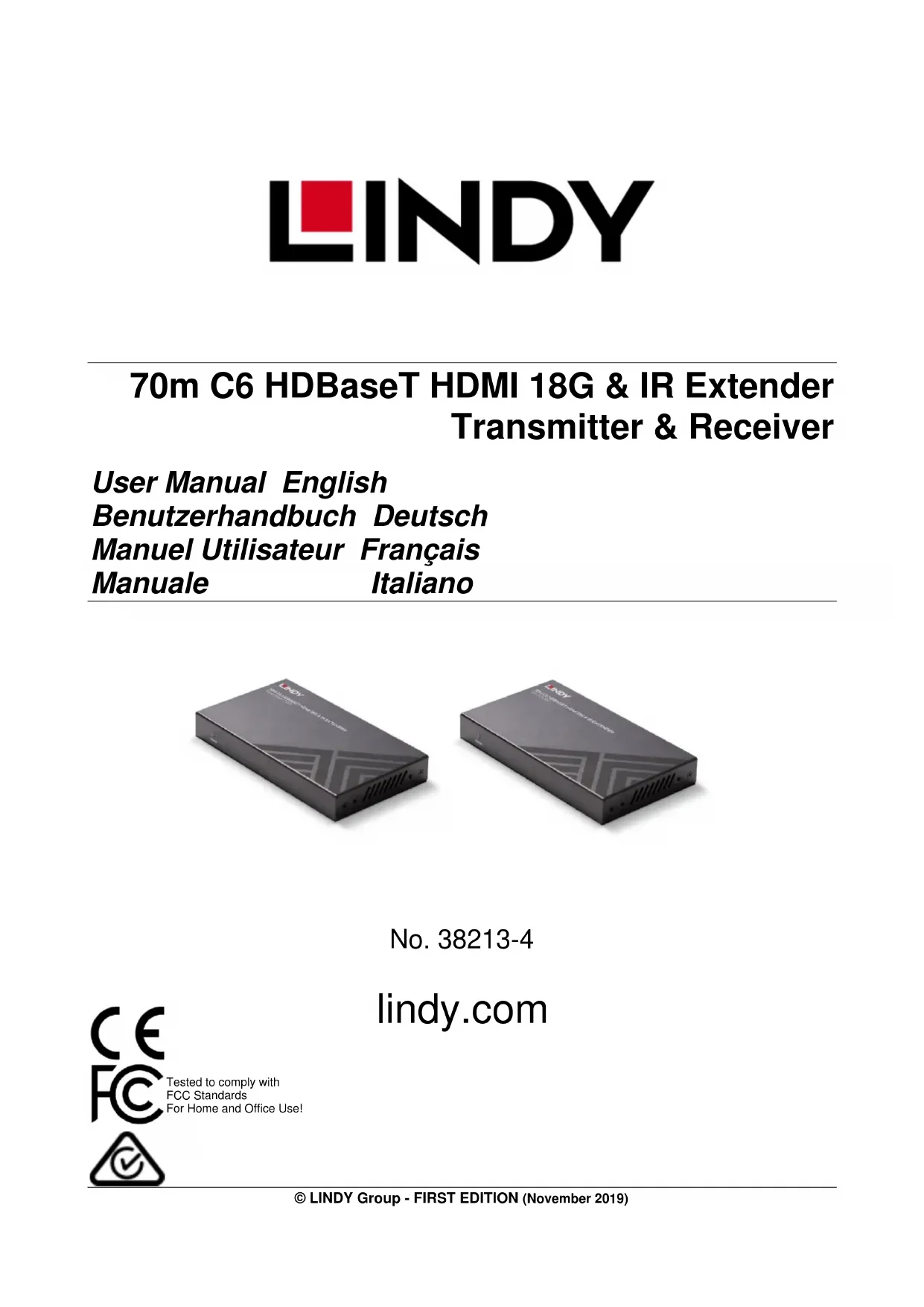 - Veuillez vous assurer que l'adaptateur utilisé est fermement fixé et verrouillé avant de l'insérer dans une prise murale. Introduction Nous sommes heureux que votre choix se soit porté sur un produit LINDY et vous remercions de votre confiance. Vous pouvez compter à tout moment sur la qualité de nos produits et de notre service. Ce kit extender C6 HDBaseT HDMI 18G & IR 70m est soumis à une durée de garantie LINDY de 2 années et d’une assistance technique gratuite à vie. Merci de lire attentivement ces instructions et de les conserver pour toute future référence. Le kit extender C6 HDBaseT HDMI 18G & IR 70m de Lindy est une solution de transmission HDMI haute performance et fiable composée de deux boîtiers relies entre eux par un câble réseau cat.6. Ce kit peut être utilisé avec un autre kit ou splitter compatible Lindy HDBaseT. HDBaseT est un standard reconnu pour la distribution haute qualité de contenu AV ainsi que d’autres technologies, y compris l’alimentation, le contrôle RS232 et l’Ethernet. La transmission s’effectue via un câble réseau cat.6 ou de qualité supérieure. La résolution prise en charge va jusqu’à la 4K Ultra HD, la vidéo transmise est en haute qualité, avec une prise en charge des contenus HDR (High Dynamic Range) pour un contraste et une palette de couleurs (espace colorimétrique) améliorés. Il s'agit d'une solution fiable pour créer une signalétique numérique accrocheuse dans le commerce de détail, des affichages immersifs lors d'événements ou des installations attrayantes dans de grandes salles de conférence ou des amphithéâtres. La fonction PoC (Power over Cable) ajoute davantage de flexibilité. Cela permet de transmettre l’alimentation via un câble réseau cat.6 en connexion point-à-point entre l’émetteur et le récepteur, une seule alimentation est donc requise sur l’unité émettrice. Idéal lorsque les prises secteur sont limitées ou absentes à côté du récepteur. Les signaux IR sont transmis de façon bidirectionnelle, la source peut donc être facilement contrôlée depuis l’écran, alors que l’écran peut également être contrôlé depuis la source HDMI. Combiné au contrôle CEC, qui permet de commander tous les équipements à partir d’une seule télécommande, ce système d’extension offre à l’utilisateur un contrôle complet. HDBaseT™ et HDBaseT sont des marques déposées de l’alliance HDBaseT. Note: les distances et résolutions indiquées sont réalisables avec une connexion directe entre l’émetteur et le récepteur en utilisant un câble cat.6 monobrin (solid core). Utiliser un autre câble, des coupleurs, prises murales ou panneaux de brassage peut réduire la distance de déport.Manuel Utilisateur Français Contenu