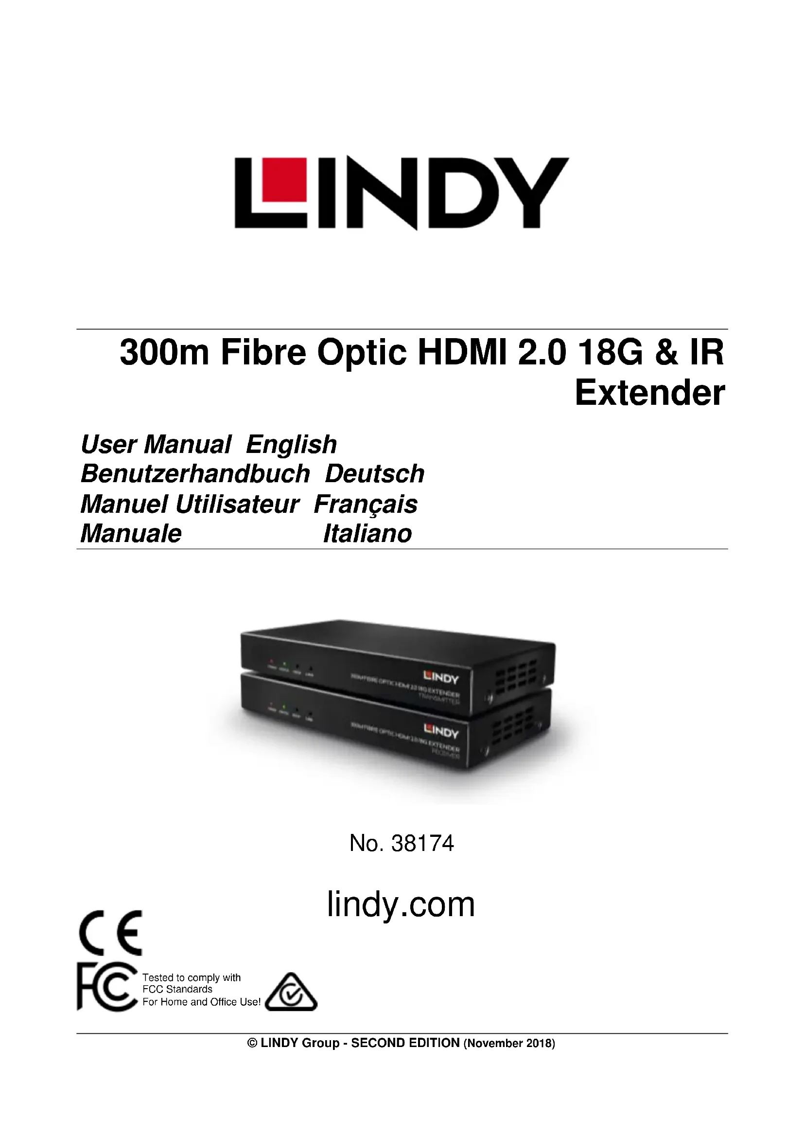 wird die LED blinken oder sie erlischt, wenn kein Videosignal vorhanden ist. Betrieb der Steuerung Bidirektionale IR-Steuerung Die IR-Fernbedienungsfunktion ermöglicht die Steuerung des Quellgeräts von der Displayseite aus. Ebenso besteht die Möglichkeit, das Display vom Quellgerät aus zu steuern.Um diese Funktion zu nutzen, schieben Sie den Dip-Schalter (‘Switch’) auf der Rückseite von Transmitter und Receiver auf die Position ‘IR‘. Stellen Sie sicher, dass alle IR-Kabel korrekt angeschlossen sind. Ein Installationsbeispiel sehen Sie hier. Bidirektionale RS232-Steuerung Die RS232-Steuerungsfunktion ermöglicht die Steuerung der Installation mit 2 unterschiedlichen RS232-Geräten, beispielweise einem PC, Projektor oder Digital Signage vom Transmitter zum Receiver, oder die Steuerung des Quellgeräts vom Receiver aus mit einer Bedieneinheit an der Wand. Um diese Funktion zu nutzen, schieben Sie den Dip-Schalter (‘Switch’) auf der Rückseite von Transmitter und Receiver auf die Position ‘RS232‘. Stellen Sie sicher, dass alle RS232-Kabel korrekt mit den Terminal Blocks verbunden sind. Beachten Sie bitte das entsprechende Pinout. Alle angeschlossenen Geräte müssen RS232 unterstütz.Manuel Utilisateur Français Introduction Nous sommes heureux que votre choix se soit porté sur un produit LINDY et vous remercions de votre confiance. Vous pouvez compter à tout moment sur la qualité de nos produits et de notre service. Cet Extender sur Fibre Optique HDMI 2.0 18G & IR est soumis à une durée de garantie LINDY de 2 ans et d’une assistance technique gratuite à vie. Merci de lire attentivement ces instructions et de les conserver pour future référence. L’Extender Fibre Optique HDMI & IR de 300m de LINDY est une solution premium pour l’extension de signaux haute qualité 4K@60Hz sur des distances incroyables en utilisant de la fibre optique LC duplex multimode (50/125µm) standard. La prise en charge des spécifications HDMI 2.0 permet de transmettre les très hautes résolutions 4K Ultra HD, tandis que les signaux de contrôle bidirectionnels IR et RS-232 offre une gestion fiable et souple des appareils au travers de l’installation. Contenu de l’emballage Emetteur (Transmitter) Récepteur (Receiver) 2 x alimentations multi-pays (EU, UK, US & AUS) 2 x modules Fibre SFP+ 2 x blocs de connexions Câble émetteur IR Câbles récepteur IR 4 x équerres de montage 8 x Vis Manuel LINDY Caractéristiques Prend en charge les résolutions jusqu’à 3840x2160@60Hz 4:4:4 8bit, ainsi que les signaux HDR HDCP 2.2/1.4 Pass-through EDID Pass-through Prise en charge audio 7.1CH pass-through Contrôle bidirectionnel IR & RS-232 (Pass-through) Prise d’alimentation Type DC à visser pour une connexion sûre (5.5/2.1mm) Spécifications Requière une fibre optique Duplex LC Multimode (50/125µm) Etend les signaux jusqu’à 300m (984.24ft), si une plus grande distance doit être atteinte, veuillez remplacer le module multimode SFP+ par un module monomode SFP+ Ports sur l’émetteur: Entrée: HDMI Type A (femelle), Sortie: Duplex LC Ports sur le récepteur: Entrée: Duplex LC, sortie: HDMI Type A (femelle) Ports de contrôle bidirectionnel: RS-232 (bloc de connexion), IR (femelle) Température de fonctionnement: 0°C - 45°C (32°F - 113°F) Température de stockage: -20°C - 70°C (-4°F - 158°F) Humidité: 10 - 90% RH (sans condensation) Alimentation: 12VDC 0.5A Dimensions: 150x20x74.4mm (5.91x0.79x2.93in)Manuel Utilisateur Français Installation Merci de suivre les étapes ci-dessous pour une installation avec des équipements sources HDMI, si vous utiliser un équipement DVI, veuillez substituer les câbles HDMI par des câbles DVI vers HDMI comme requis.