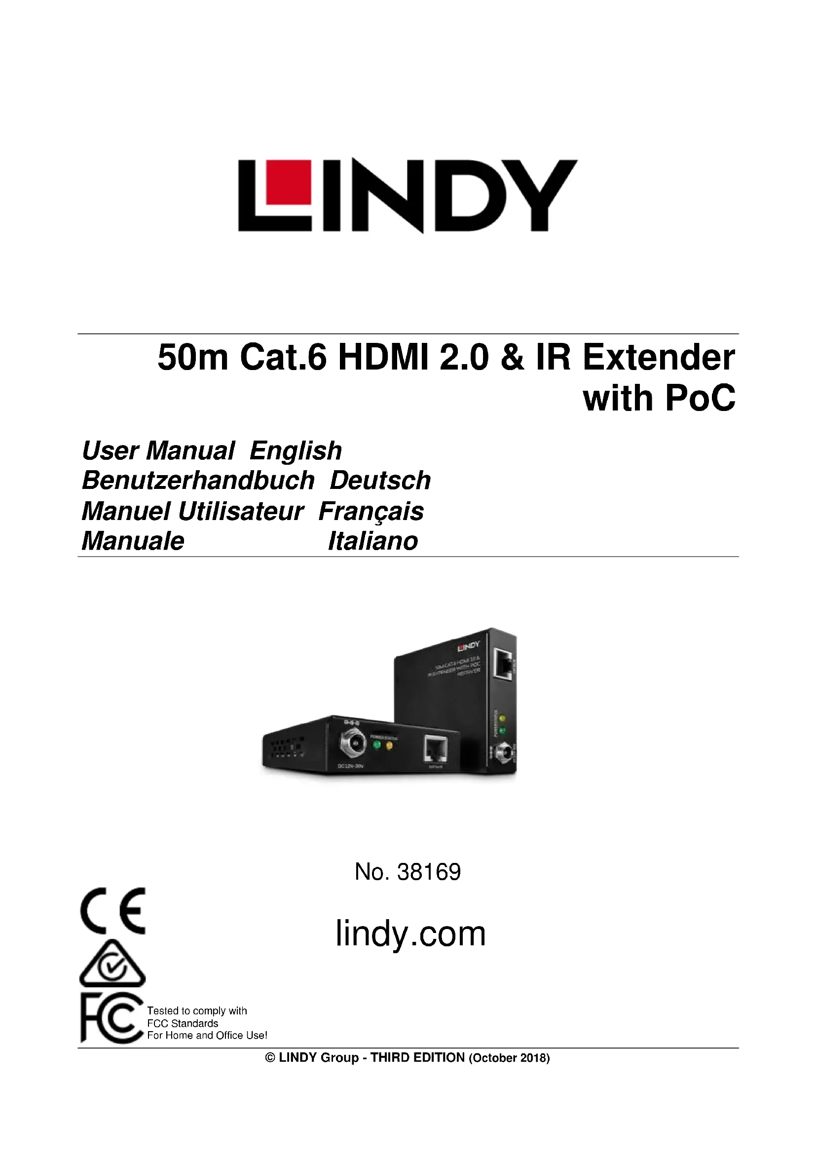 Fehlersuche Der Monitor zeigt kein Bild. Überprüfen Sie den korrekten Anschluss des Netzteils. Vergewissern Sie sich, dass das Cat.5e/6-Kabel fest angeschlossen ist und dass die Power- bzw. Status-LEDs leuchten. Stellen Sie sicher, dass die HDMI-Signalquelle und das Display mit Strom versorgt werden und in Betrieb sind. Schalten Sie alle Geräte aus, dann schalten Sie in dieser Reihenfolge wieder ein: zuerst den Transmitter, dann das Display und zum Schluss die Signalquelle. Bei einigen HDMI-Geräten kann es erforderlich sein, das HDMI-Kabel abzuziehen und den HDMI- Handshake erneut zu initialisieren. Verringern Sie die Länge des Cat.5e/6- oder HDMI-Kabels oder verwenden Sie ein höherwertiges Kabel. Beachten Sie die in der Einführung genannten maximalen Kombinationen von Distanz, Auflösung und Kabel. Schließen Sie das Netzteil am anderen Ende der Installation an.Manuel Utilisateur Français Introduction Nous sommes heureux que votre choix se soit porté sur un produit LINDY et vous remercions de votre confiance. Vous pouvez compter à tout moment sur la qualité de nos produits et de notre service. Cet Extender HDMI 2.0 & IR Cat.6 50m avec PoC est soumis à une durée de garantie LINDY de 2 ans et d’une assistance technique gratuite à vie. Merci de lire attentivement ces instructions et de les conserver pour future référence. L’Extender HDMI 2.0 & IR Cat.6 50m avec PoC Lindy est une solution efficace et fiable pour étendre des signaux HDMI 4K de haute qualité sur des distances allant jusqu’à 50m (164.04ft) avec un câble réseau Cat.5e/6 standard. L’extender se compose d’un module émetteur (transmitter ou Tx) et d’un module récepteur (receiver ou Rx), accompagné d’une alimentation multi-pays. La prise en charge des spécifications HDMI 2.0 permet la transmission des résolutions haute définition 4K Ultra HD sans aucune compression des signaux, alors que la fonctionnalité PoC fournit la possibilité de n’utiliser qu’une seule alimentation pour tout le système. Cette alimentation se branche via une prise DC jack à visser fournissant une connexion sécurisée, parfait pour les installations professionnelles où des déconnexions accidentelles pourraient survenir. Pour obtenir de bonnes performances, nous recommandons l’utilisation de câble réseau de haute qualité monobrin (solid core). Merci de vous référer au tableau ci-dessous au sujet des résolutions maximales en fonction de la distance et du type de câble. Type de câble Distances Résolutions Cat.5e UTP/STP monobrin/solid core 50m (164.04ft) 1920x1080p@60Hz 4:4:4 8bit,(Inc. 3D) Cat.5e UTP/STP monobrin/solid core 30m (98.42ft) 3840x2160@60Hz 4:4:4 8bit 3840x2160@60Hz 4:2:0 12bit Cat.6 UTP/STP monobrin/solid core Cat.7 S/FTP monobrin/solid core 50m (164.04ft) 3840x2160@60Hz 4:4:4 8bit 3840x2160@60Hz 4:2:0 12bit