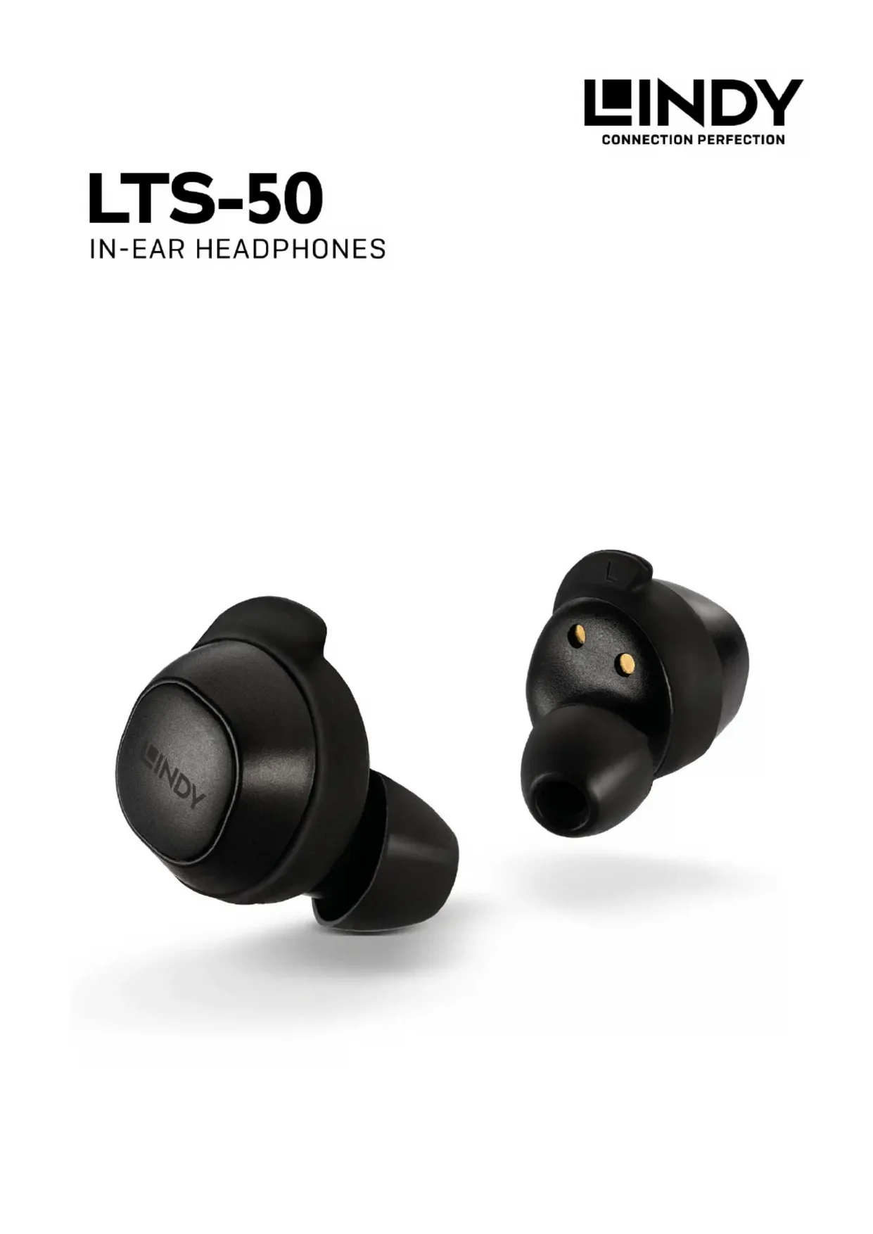 - Lors du nettoyage des écouteurs n’utilisez qu’un chiffon sec. Introduction Les écouteurs LTS-50 de Lindy sont une combinaison des éléments qui sont importants pour vous afin d’obtenir une expérience d'écoute exceptionnelle. Ces écouteurs intra-auriculaires sans fil sont un partenaire révolutionnaire pour votre musique, vos vidéos, vos jeux et vos appels. Lindy vous aide à atteindre la perfection de la connexion avec votre audio dans tous les aspects de votre vie. Totalement sans fil. Les LTS-50 sont de véritables écouteurs sans fil qui se connecteront instantanément à votre appareil lorsqu'ils seront retirés de leur étui grâce à la technologie Bluetooth 5.0. La transmission simultanée permet une lecture en stéréo ou en mono, si nécessaire. Excellente qualité de lecture audio. Les haut-parleurs 6 mm assurent une lecture audio dynamique quel que soit le genre de musique que vous écoutez. Des basses riches et solides. Une clarté superbe. Des aigus percutants. Le LTS-50 garantit des performances audio supérieures pour tous les types de contenu, de la musique aux podcasts en passant par les films et les jeux. Léger. Confortable. Sécurisé. Raffiné. Chaque oreillette ne pèse que 4,1 g pour un confort même en cas d'utilisation prolongée et peut être posée en toute sécurité avec un choix de 3 embouts en silicone ou 3 embouts en mousse à mémoire de forme. Le LTS-50 a été conçu pour s'adapter de manière optimale à tous les types d'oreilles tout en assurant une excellente lecture audio. Contrôle intuitif et transparent. La lecture peut être facilement contrôlée d'un simple toucher du doigt. Une simple pression permet de mettre en pause et de lire le contenu, une double pression pour passer à la piste suivante ou une triple pression pour passer à la chanson précédente. Une pression longue permet de régler le volume en fonction de l'écouteur utilisé, tandis qu'une pression courte permet de faire apparaître l'assistant vocal des appareils connectés pour une expérience entièrement sans fil.15 Contenu de l’emballage