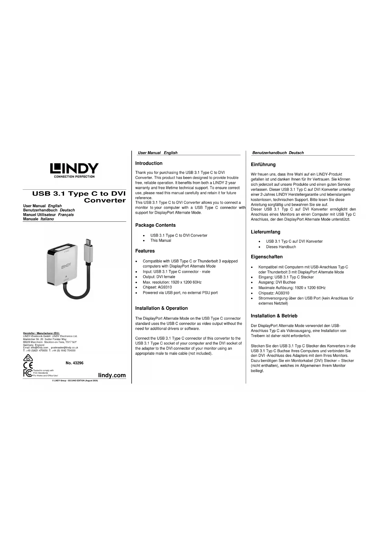 Tested to comply with FCC Standards. For Home and Office Use Introduction Nous sommes heureux que votre choix se soit porté sur un produit LINDY et vous remercions de votre confiance. Vous pouvez compter à tout moment sur la qualité de nos produits et de notre service. Ce convertisseur USB 3.1 Type C vers DVI est soumis à une durée de garantie LINDY de 2 années et d’une assistance technique gratuite à vie. Merci de lire attentivement ces instructions et de les conserver pour future référence. Ce convertisseur USB 3.1 Type C vers DVI vous permet de connecter un moniteur à un ordinateur possédant une interface de connexion USB Type C qui prend en charge la fonction DisplayPort Alternate Mode. Contenu du package