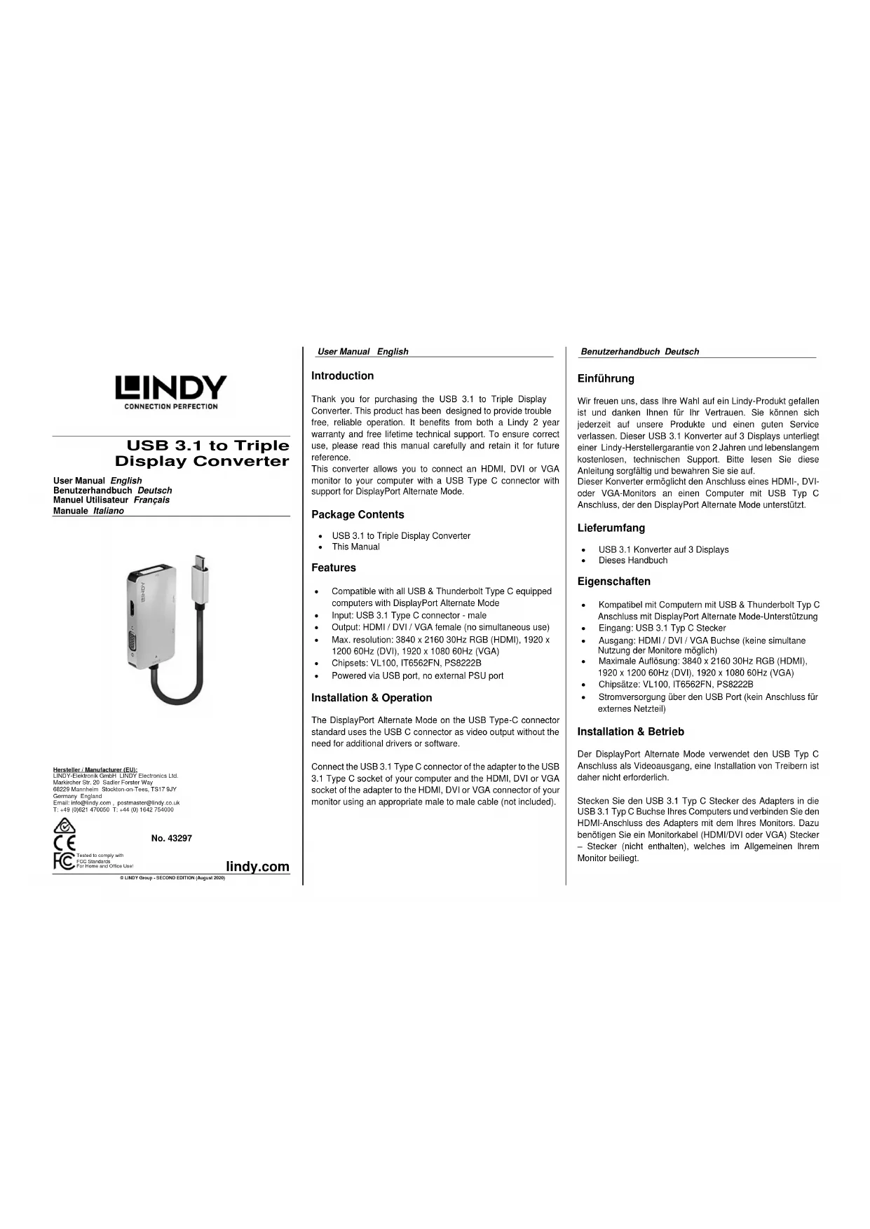 Tested to comply with FCC Standards. For Home and Office Use Introduction Nous sommes heureux que votre choix se soit porté sur un produit Lindy et vous remercions de votre confiance. Vous pouvez compter à tout moment sur la qualité de nos produits et de notre service. Ce convertisseur USB 3.1 vers Triple Display est soumis à une durée de garantie Lindy de 2 ans et d’une assistance technique gratuite à vie. Merci de lire attentivement ces instructions et de les conserver pour future référence. Ce convertisseur vous permet de brancher un écran HDMI, DVI ou VGA à votre ordinateur disposant d’un connecteur USB Type C qui prend en charge la fonction DisplayPort Alternate Mode. Contenu de la livraison