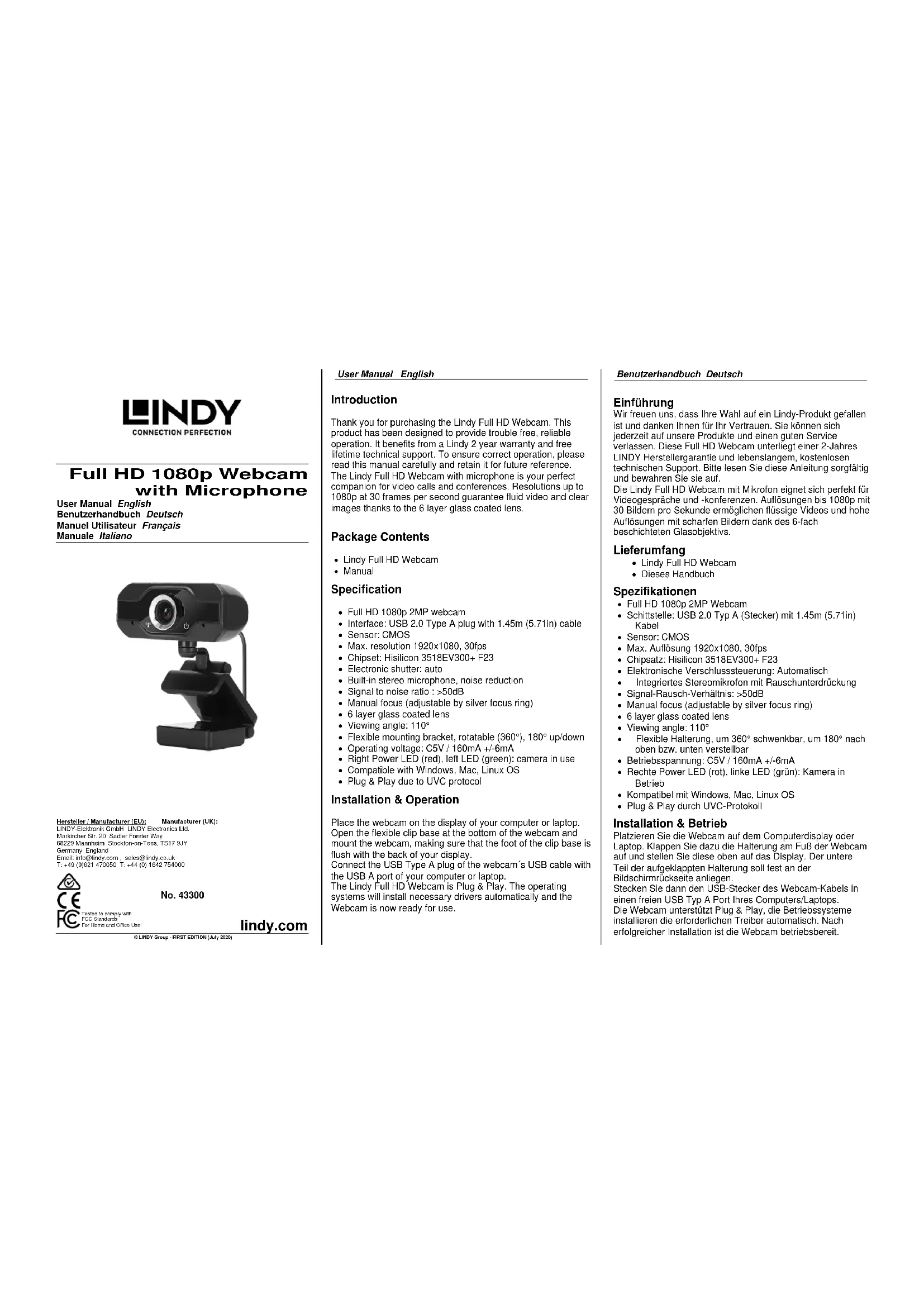 Tested to comply with FCC Standards. For Home and Office Use Introduction Nous sommes heureux que votre choix se soit porté sur un produit LINDY et vous remercions de votre confiance. Vous pouvez compter à tout moment sur la qualité de nos produits et de notre service. Cette Webcam Full HD de LINDY est soumise à une durée de garantie de 2 ans et d’une assistance technique gratuite à vie. Merci de lire attentivement ces instructions et de les conserver pour future référence. La Webcam Full HD avec microphone de LINDY est le parfait compagnon pour vos appels et conférences vidéo. La résolution 1080p à 30 images seconds garantie une vidéo fluide et des images claires grâce à la lentille en verre 6 couches. Contenu de l’emballage