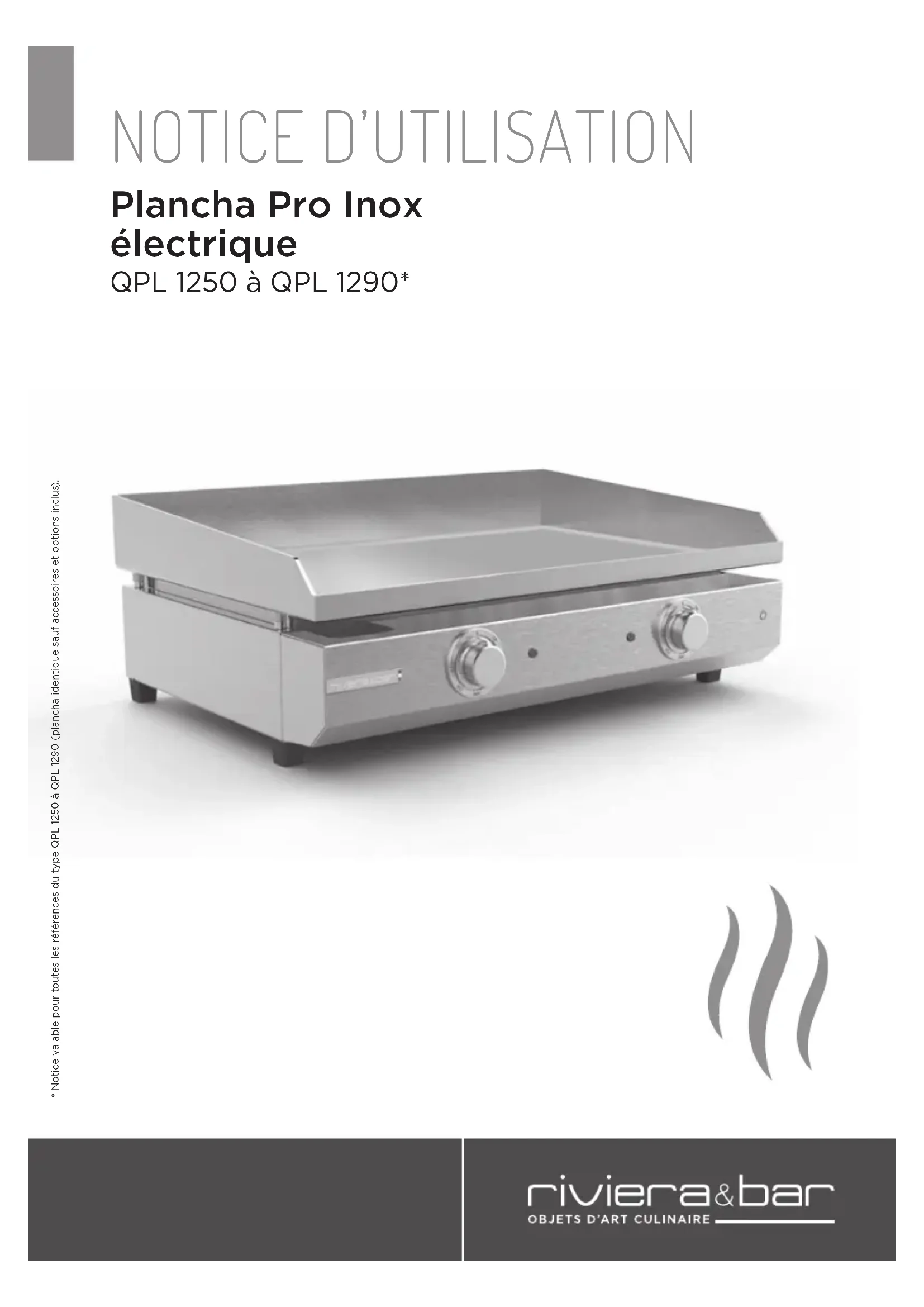 - Notice valable pour toutes les références du type QPL 1250 à QPL 1290 (plancha identique sauf accessoires et options inclus).2 Avec cet appareil, vous avez fait l’acquisition d’un article de qualité, bénéficiant de toute l’expérience de Riviera-et-Bar dans le domaine de la cuisson. Il répond aux critères de qualité Riviera-et-Bar : les meilleurs matériaux et composants ont été utilisés pour sa fabrication, et il a été soumis à des contrôles rigoureux. Nous souhaitons que son usage vous apporte entière satisfaction.3 DEsCRiPTion Du PRoDuiT 4 RECoMMAnDATions DE séCuRiTé généRALEs 5 RECoMMAnDATions DE séCuRiTé PARTiCuLièREs 8 AVAnT LA PREMièRE MisE En sERViCE 9 MisE En sERViCE 10 TRuCs ET AsTuCEs 11 nETToyAgE ET EnTRETiEn 12 nETToyAgE AVAnT LA PREMièRE MisE En sERViCE 12 nETToyAgE APRès uTiLisATion 12 RAngEMEnT 14 guiDE DE DéPAnnAgE 14 CARACTéRisTiQuEs TEChniQuEs 15 EnViRonnEMEnT 15 PRéConisATions D'EMBALLAgE 15 ACCEssoiREs 15 gARAnTiE 15 sommaire4