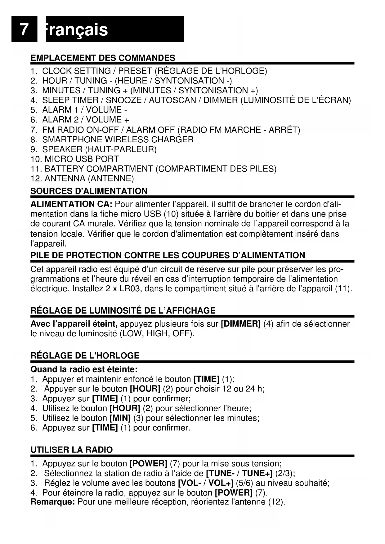 SOURCES D'ALIMENTATION ALIMENTATION CA: Pour alimenter l’appareil, il suffit de brancher le cordon d'ali- mentation dans la fiche micro USB (10) située à l'arrière du boitier et dans une prise de courant CA murale. Vérifiez que la tension nominale de l`appareil correspond à la tension locale. Vérifier que le cordon d'alimentation est complètement inséré dans l'appareil. PILE DE PROTECTION CONTRE LES COUPURES D’ALIMENTATION Cet appareil radio est équipé d’un circuit de réserve sur pile pour préserver les pro- grammations et l’heure du réveil en cas d’interruption temporaire de l’alimentation électrique. Installez 2 x LR03, dans le compartiment situé à l'arrière de l’appareil (11). RÉGLAGE DE LUMINOSITÉ DE L’AFFICHAGE Avec l’appareil éteint, appuyez plusieurs fois sur [DIMMER] (4) afin de sélectionner le niveau de luminosité (LOW, HIGH, OFF).