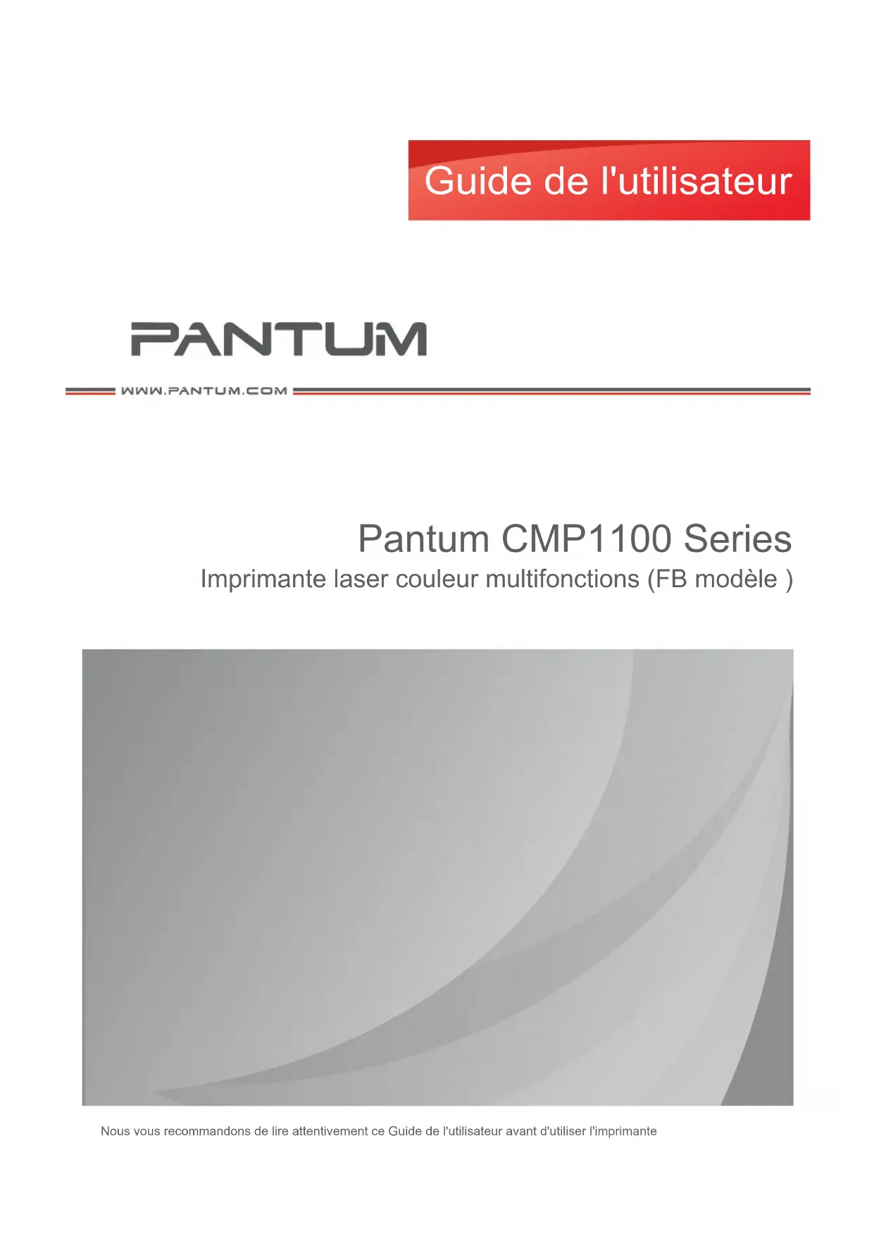 Pantum CMP1100 Series Imprimante laser couleur multifonctions (FB modèle ) Guide de l'utilisateur Nous vous recommandons de lire attentivement ce Guide de l'utilisateur avant d'utiliser l'imprimanteI Préface Bienvenue parmi les produits Pantum Series ! Nous vous remercions d'avoir choisi nos produits Pantum Series ! Afin de protéger vos intérêts, veuillez lire attentivement les articles suivants. Avis juridique Marque commercial Pantum et les logos Pantum sont des marques déposées de Zhuhai Pantum Electronics Co., Ltd. Microsoft®, Windows®, Windows Server® et Windows Vista® sont des marques déposées de Microsoft Corporation aux États-Unis et/ou dans d'autres pays/régions. Apple, AirPrint and macOS are trademarks of Apple Inc., registered in the U.S. and other countries.Use of the Works with Apple badge means that an accessory has been designed to work specifically with the technology identified in the badge and has been certified by the developer to meet Apple performance standards. Mopria®, the Mopria® Logo, and the Mopria Alliance™ word mark and logo are registered and/or unregistered trademarks and service marks of Mopria Alliance, Inc. in the United States and other countries. Unauthorized use is strictly prohibited. Wi-Fi Direct,Wi-Fi Protected Setup(WPS),WPA,WPA2 et Wi-Fi Protected Access sont des marques de Wi-Fi Alliance. Les noms des logiciels figurant dans ce Guide de l'utilisateur appartiennent à leurs societies respectives conformément à l'accord de licence correspondant. Toute référence à ces logiciels est donnée à titre purement indicatif. Tous les autres noms de produits et de marques mentionnés dans le présent document peuvent être des marques déposées, des marques commerciales ou des marques de service de leurs propriétaires respectifs. Toute référence à ces noms est donnée à titre purement indicatif. Droits d'auteur Les droits d'auteur de ce Guide de l'utilisateur appartiennent à Zhuhai Pantum Electronics Co., Ltd. Il est interdit de copier, traduire, modifier ou transmettre ce Guide de l'utilisateur par quelque moyen ou sous quelque format que ce soit, sans le consentement écrit préalable de Zhuhai Pantum Electronics Co., Ltd. Version: V1.0 Clause de non-responsabilité Pour une meilleure expérience de l'utilisateur, Zhuhai Pantum Electronics Co., Ltd. se reserve le droit d'effectuer des modifications sur ce Guide de l'utilisateur. Les informations continues dans le présent document sont susceptibles d'être modifiées sans préavis. Les utilisateurs sont responsables des dommages résultant d'une utilisation incorrecte de ce Guide de l'utilisateur. En outre, hormis la garantie explicite accordée dans le manuel de maintenance du produit ou dans notre engagement de service, Zhuhai Pantum Electronics Co., Ltd. ne donne aucune garantie, explicite ou implicite, liée à ce Guide de l'utilisateur (y compris sur les formulations choisies). L'utilisation de ce produit en vue de copier, imprimer ou numériser certains documents ou images, ou pour réaliser d'autres types d'opérations peut être interdite par certaines lois régionales.II En cas de doute concernant la légalité de l'utilisation de ce produit pour certains types de documents ou images, veuillez, au préalable, consulter votre conseiller juridique. Le produit peut être utilisé en toute sécurité uniquement dans les zones non tropicales jusqu'à 2000 mètres au-dessus du niveau de la mer. Mesures de sécurité Débranchez le produit de l'alimentation électrique Le produit doit être placé près ou de façon accessible de la prise pour débrancher et couper l'alimentation rapidement! Sécurité du laser Les rayonnements laser sont dangereux pour le corps humain. Les composants laser étant entièrement scellés dans l'imprimante, aucune fuite du rayonnement laser ne pourra être observée. Pour éviter les rayonnements laser, veuillez ne pas démonter l'imprimante sans connaissance préalable. L'imprimante respecte les dispositions prévues pour les produits laser de Classe 1 selon la norme CFR. L'imprimante possède un laser à diode de Classe III b, qui ne présente aucune fuite de rayonnement parmi les composants laser. Les composants laser doivent conformer avec les exigences de: Code Américain des Régulations Fédérales, 21 CFR 1040, IEC 60825-1. Avertissement de sécurité Veuillez prendre connaissance des avertissements de sécurité suivants avant d'utiliser l'imprimante: Avertissement