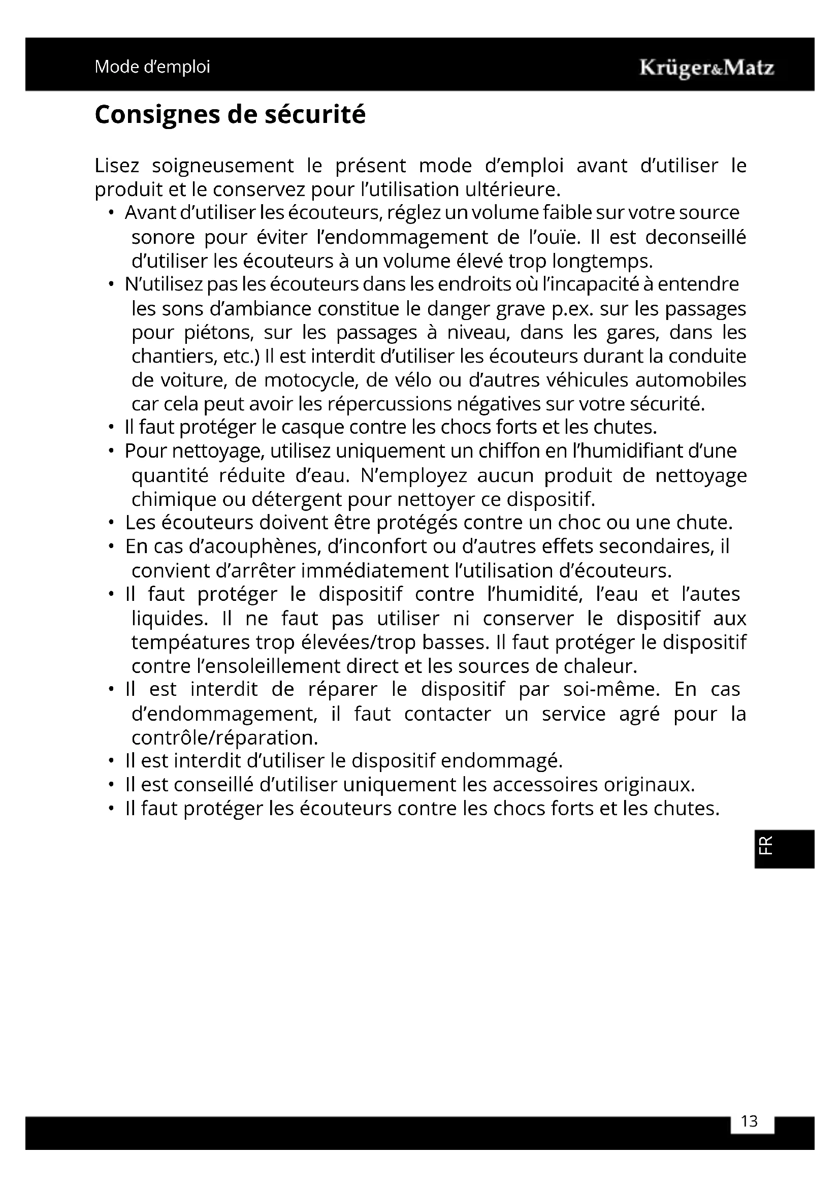 convient d’arrêter immédiatement l’utilisation d’écouteurs. Il faut protéger le dispositif contre l’humidité, l’eau et l’autes liquides. Il ne faut pas utiliser ni conserver le dispositif aux tempéatures trop élevées/trop basses. Il faut protéger le dispositif contre l’ensoleillement direct et les sources de chaleur. Il est interdit de réparer le dispositif par soi-même. En cas d’endommagement, il faut contacter un service agré pour la contrôle/réparation. Il est interdit d’utiliser le dispositif endommagé. Il est conseillé d’utiliser uniquement les accessoires originaux. Il faut protéger les écouteurs contre les chocs forts et les chutes.